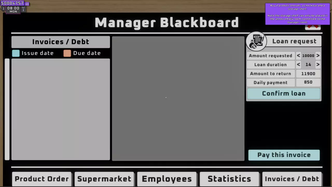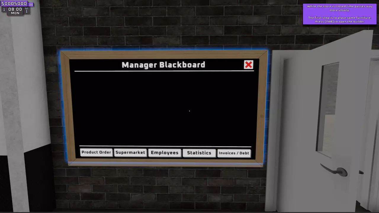 在此标签页中,你可以更改你的超市名称(商店外招牌上的商业名称)。 5. 经理黑板 - D(员工)