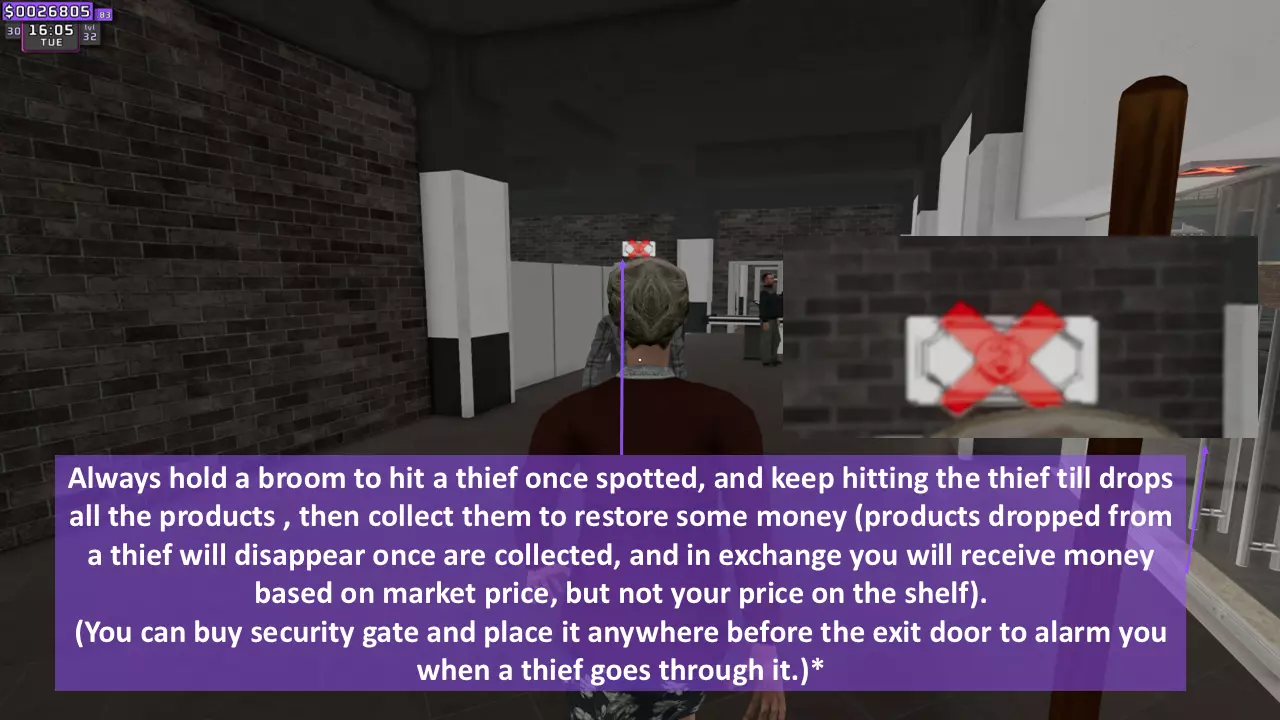 小偷:这就是为什么你的市场营业时必须手持扫帚。他们会突然出现,带有上图所示的符号。安装摄像头和保安台可以避免这种情况,但随着等级提升会变得更难,所以只需雇佣保安或将他们赶走并追回商品。 注意:小偷不会发出任何声响,在安装安检门之前不会提醒你 2. 损坏的电子产品