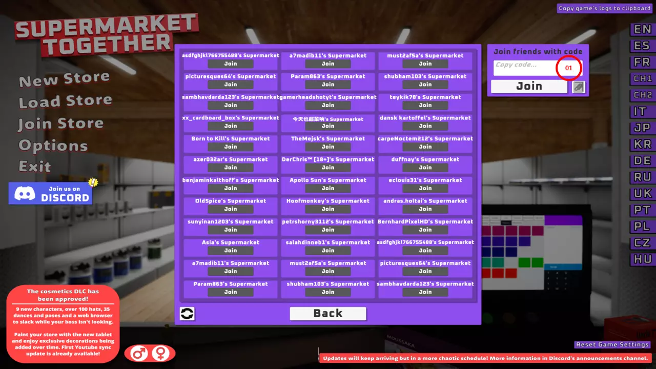 让我们开始吧: 点击“加入商店”,你可以通过点击列表中显示的商店或输入主机分享的加入代码,加入其他在线玩家或与他们一起游戏。 01/在此处粘贴分享的加入代码,以加入分享代码的好友。 ------------------------------------------------------------------------------------------------------------------------------------ E. 选项菜单