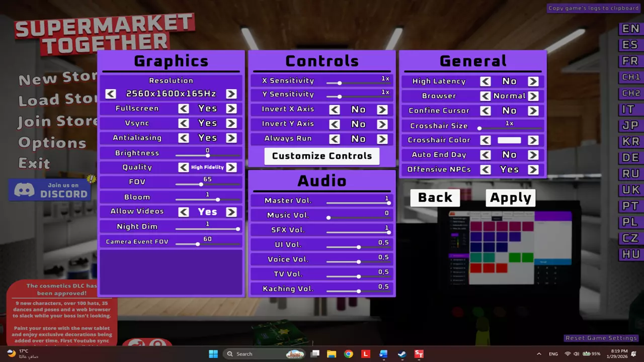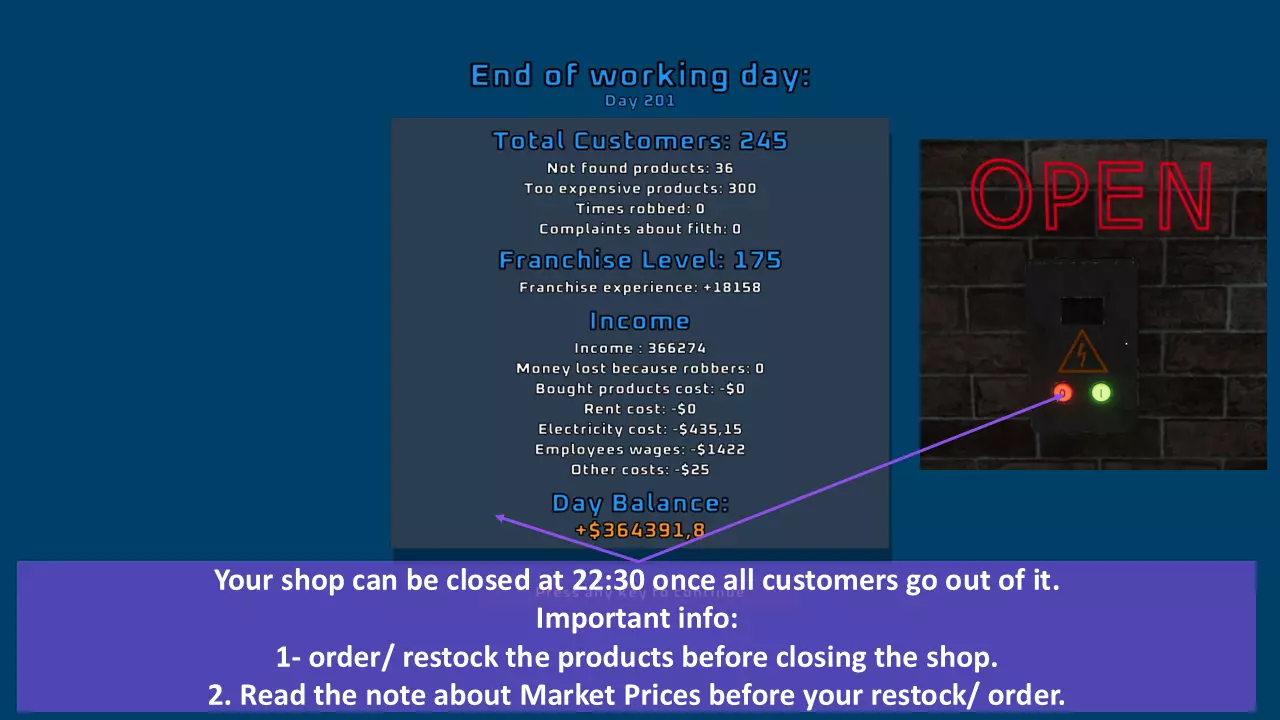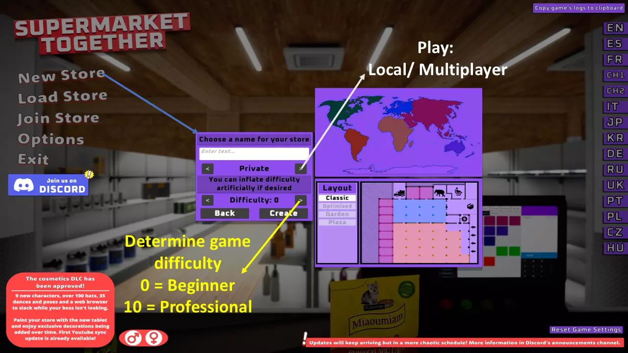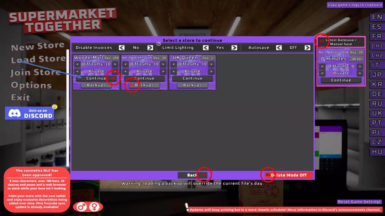 让我们看看它的运作方式: 点击“新游戏”选项即可开始新游戏并创建新的游戏存档,你可以为自己的商店输入任意名称,还可以选择本地游玩或与其他玩家联机(作为大厅主机或玩家)。此外,你还能在0到10的范围内选择游戏难度,其中0代表新手难度,10则是最高难度,专为通关过整个游戏的专业玩家设计。 01/ 点击此选项可加载所选商店的已保存游戏。 02/ 如果你操作失误,想要回到前几天(那时你可能花费更少,或者还没有遭受任何产品或金钱损失),可以点击此选项。03/ 点击此选项可加载最近的手动保存游戏。(注意:手动存档只能保存一个店铺,如果你手动保存其他店铺,将会覆盖之前的存档并导致之前的手动存档丢失) 注意:禁用发票会降低游戏的真实度,因为这将阻止店铺生成工资、租金和电费等账单。 D. 加入好友/其他玩家的在线游戏