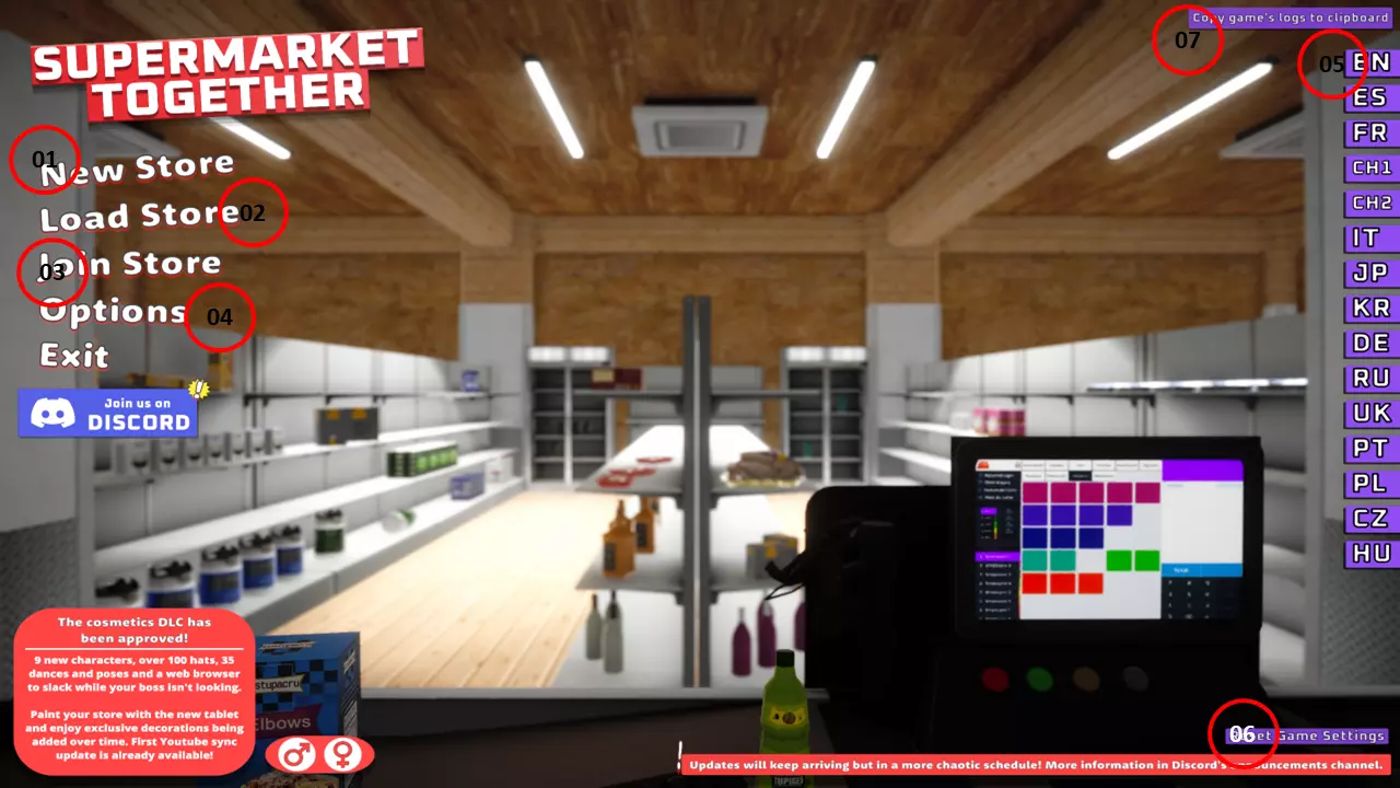这是一个非常基础的主菜单,各项功能易于识别,具体如下: 01/ 点击此选项以新商店开始新游戏。 02/ 点击此选项加载您的已保存游戏进度。(您可以选择加载任何已保存的游戏进度) 03/ 点击此选项加入在线会话,与其他玩家或好友一起游戏。 04/ 点击此选项调整您的游戏设置。 05/ 选择您的语言。 06/ 点击此选项恢复默认设置。 07/ 点击此选项复制游戏日志作为辅助备份。 注意:您可以通过点击性别图标选择玩家性别(男/女)。 ------------------------------------------------------------------------------------------------------------------------------------ B. 开始新游戏