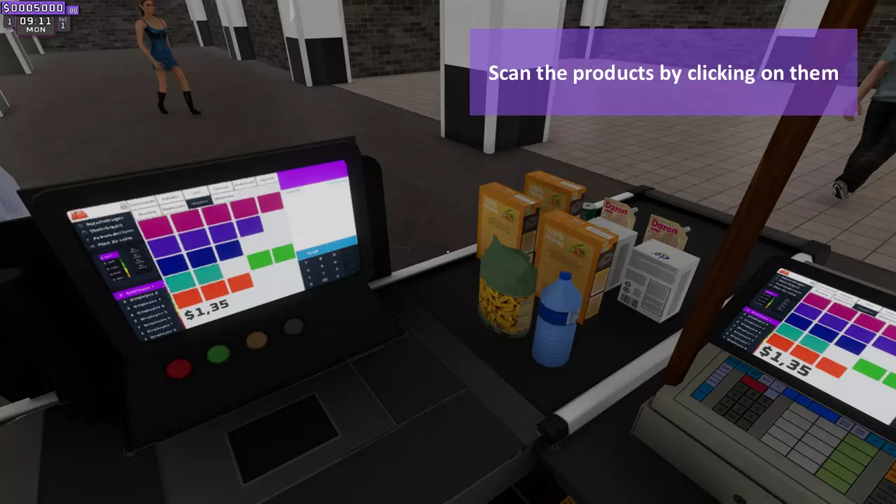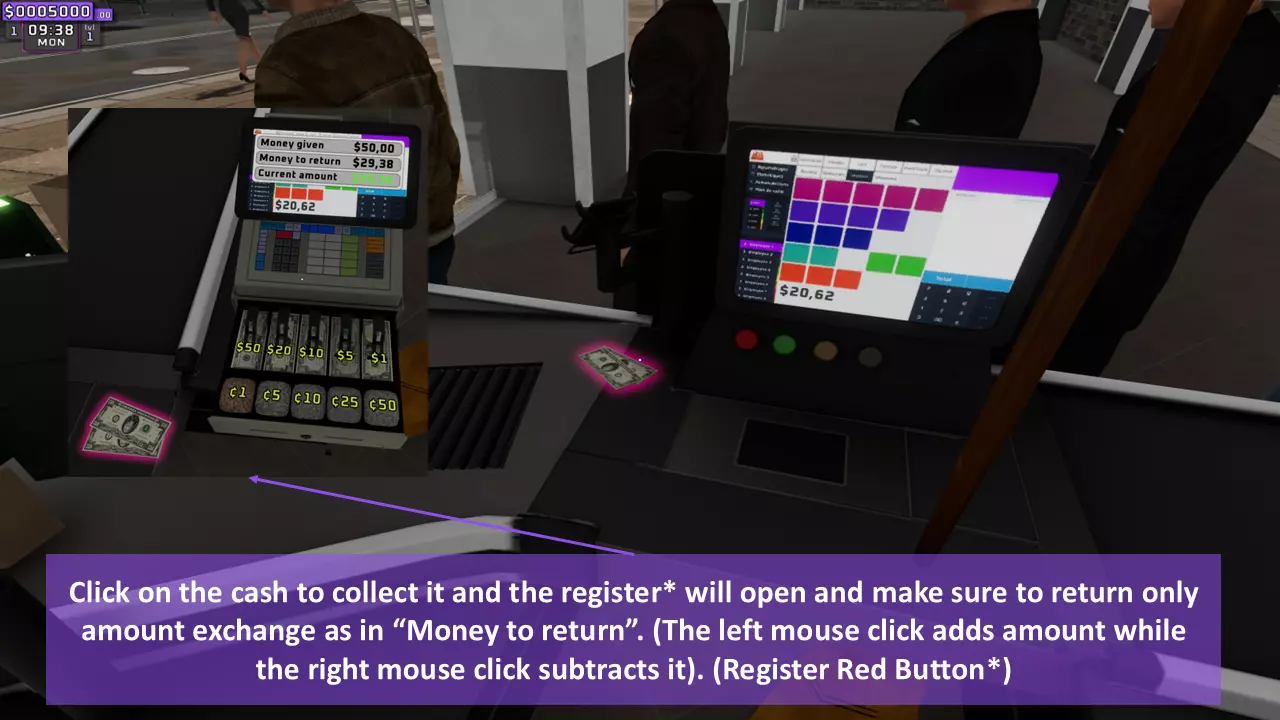 点击结账界面中的任何物品后,该物品会自动录入结账系统并放入顾客将带走的购物袋中,无需玩家进行任何干预。 2. 结账时间!B - 处理现金
