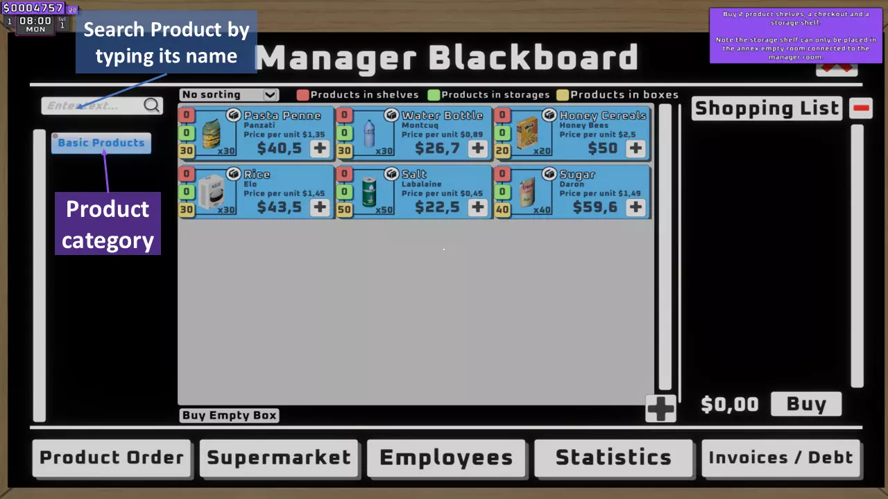 此标签页显示您在【特许经营板】解锁后可订购的所有产品。 4. 经理黑板 - C(超市名称)