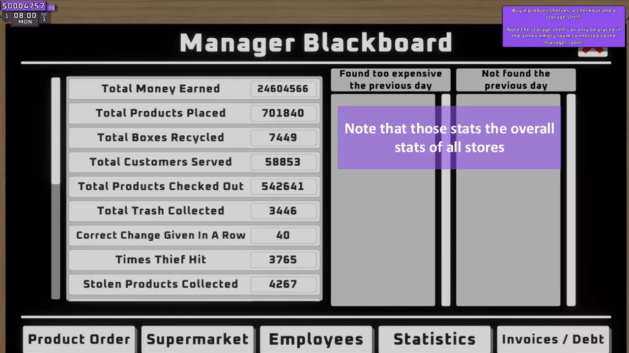 此标签页可用于导航至雇佣新员工或为他们分配任务,例如收银员。 6. 经理黑板 - E(统计数据)