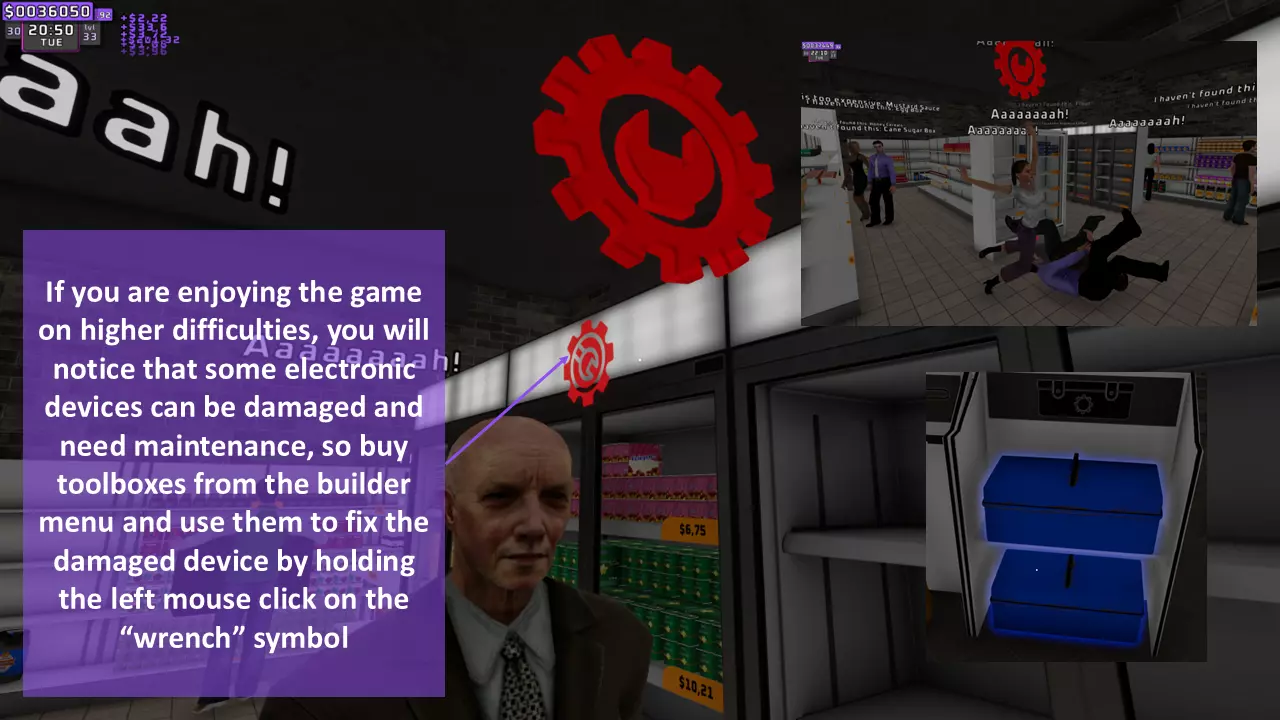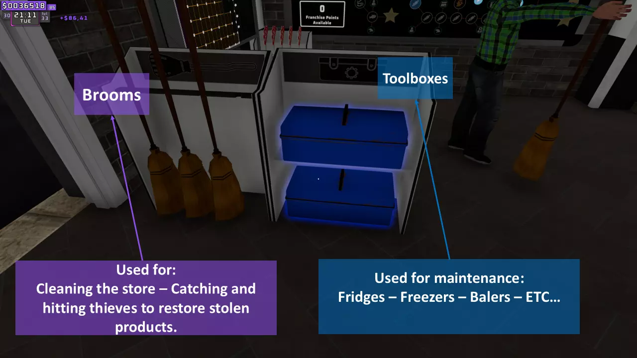 购买工具箱整理器,为修复任何损坏做好准备。当设备(电器)损坏时,会出现扳手图标,请注意留意。 3. 地面脏了? 顾客会在你的店里扔垃圾,所以拿起扫帚打扫店铺吧。 ------------------------------------------------------------------------------------------------------------------------------------ D. 关店