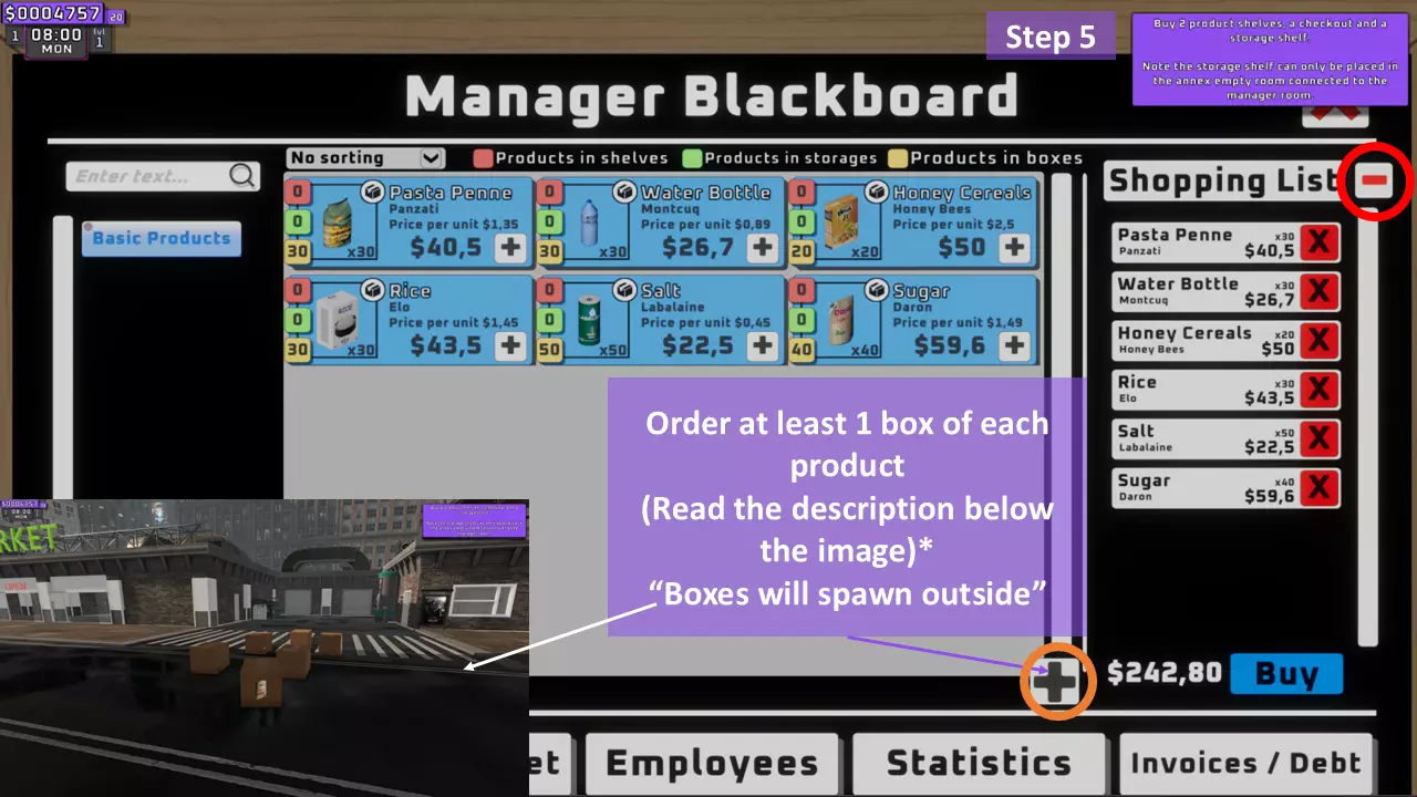 点击橙色圆圈内的大加号(+)会将所选类别的所有商品添加到购物清单,而红色圆圈内的大减号(-)会将所有商品从购物清单中移除。(个人建议将本阶段剩余的所有资金都用于购买可用商品) 注意:必须先获取特许经营面板上的第一个商品增益,然后才能下单。 第6步(共11步):放置商品