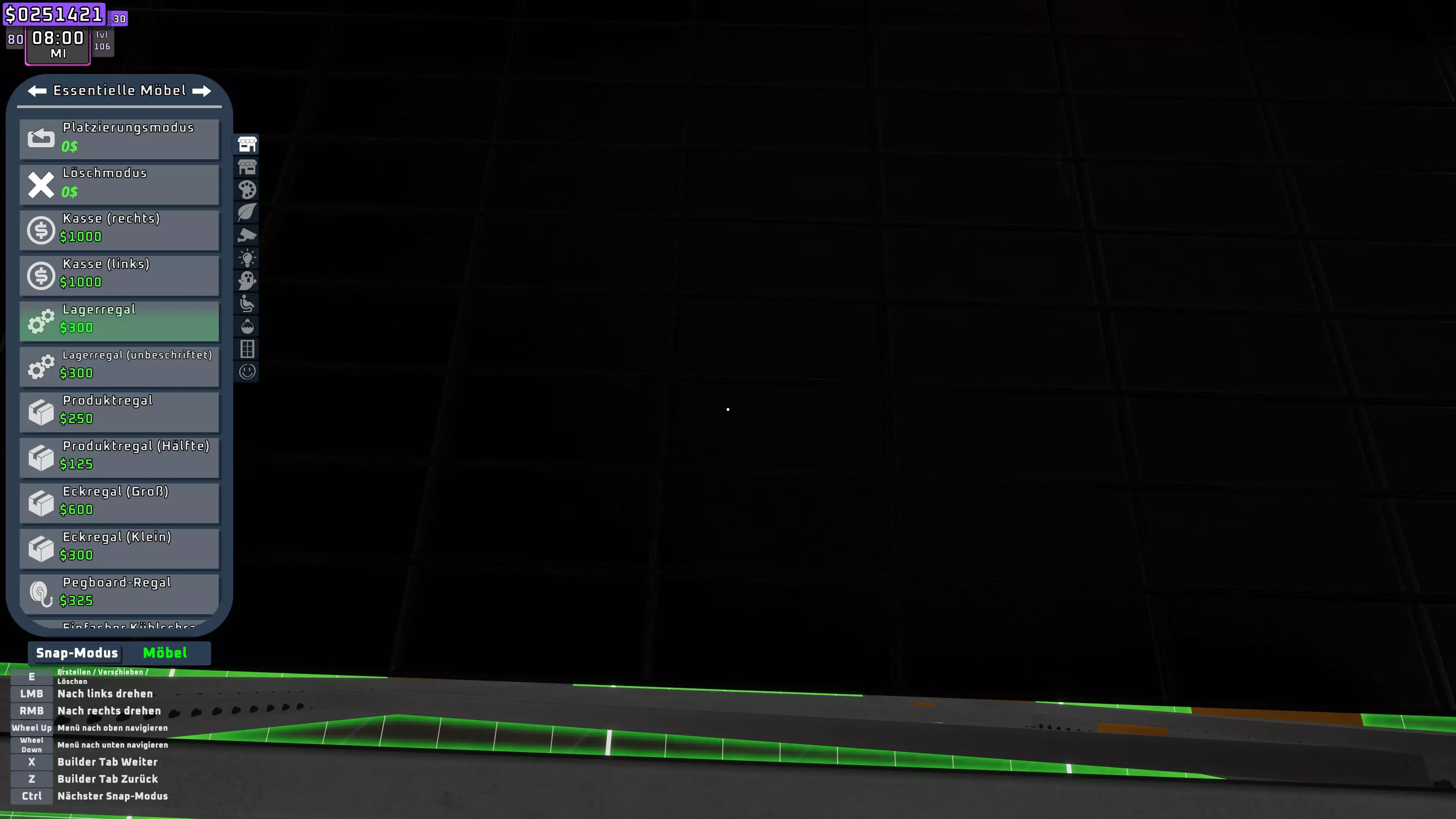 将自己背靠墙壁站得很近,面朝地面。现在打开建造菜单,将储物架尽可能近地放置在自己身体内部。