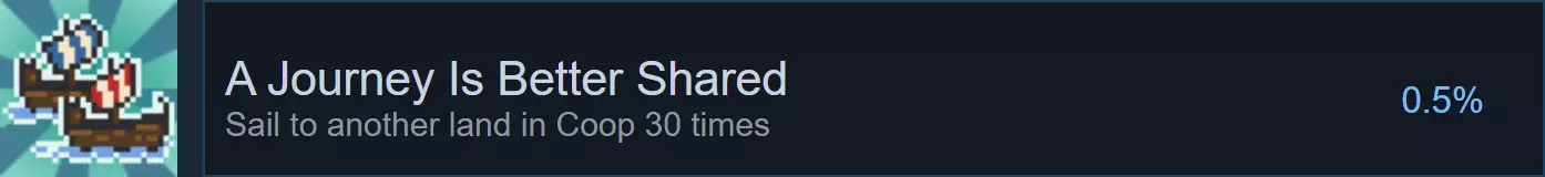(14及其他)目标:持续在1号岛和2号岛之间航行。 这里还有一个成就可以获取,你可以通过在岛屿之间进行合作航行来获得。我会选择1号岛和2号岛,因为它们很容易选择,但这其实无关紧要。只需这样做50次即可解锁A Journey Is Better Shared。