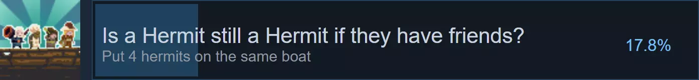 如果你仍需获取成就Is a Hermit still a Hermit if they have friends?,请继续操作。若已获取,可直接进行最后的清理流程。 你仍需该成就?首先,解锁隐士【稳定】(消耗1宝石),然后前往1号岛。 3. 1号岛:解锁隐士【弹道】(消耗3宝石),然后前往3号岛。 4. 3号岛:解锁隐士【烘焙】(消耗4宝石),然后前往4号岛。 5. 4号岛:解锁最后一位隐士【骑士】(消耗2宝石),然后前往任意随机岛屿。完成这些步骤后,应该就能解锁成就Is a Hermit still a Hermit if they have friends?了。