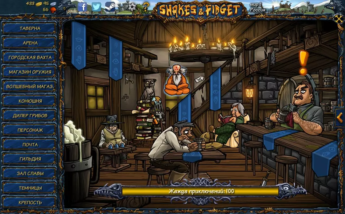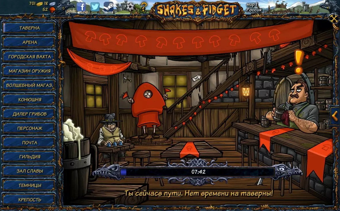 在这个房间里,你会看到三个主要的互动角色: - 左边桌子旁坐着一个“骗子”,他会用“猜球”游戏来赌你的财产。无论你多么努力地盯着球看,结果仍然是随机的,所以这是一个靠运气的游戏。 - 中间桌子旁坐着一个雇主,他正在寻找雇佣兵来执行任务。你可以从三个任务中选择一个,任务中会说明路程所需时间、报酬金额,在少数情况下还会提供物品作为奖励(你可以在接取任务前查看物品的属性)。 - 吧台后面站着一位酒保,他会向你提供恢复【冒险渴望】条的服务,以便你继续完成壮举,但这需要花费蘑菇!关于任务——你的等级越高,接到的任务就越厉害,完成后获得的奖励也越多,但任务耗时会更长。不过最终你会很难计算选择完成最赚钱的任务还是最赚经验的任务,为此已经有一个现成的奖励计算器。在【奖励(银币)】中填写完成任务后获得的银币数量(请记住1金币=100银币)。 在【经验值】中填写完成任务后获得的经验值数量。 在【时间(分:秒)】中填写完成任务所需的时间。例如“5:30”——必须使用冒号。