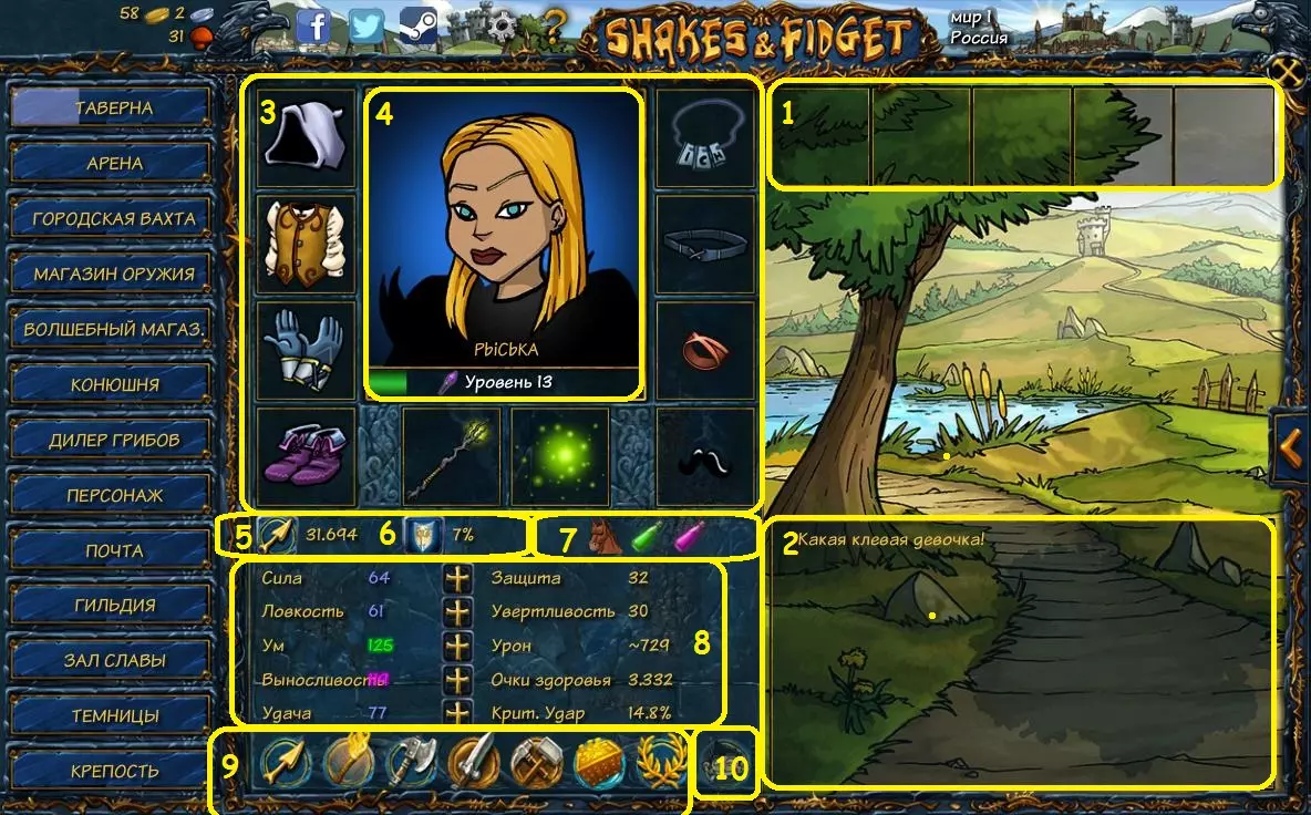 《颤抖与烦躁》是一款充满幽默的奇幻角色扮演游戏恶搞作品,采用浏览器平台和Flesh引擎开发。尽管游戏看似简单,却荣获“最佳角色扮演游戏”之一的奖项!听起来是不是很不可思议?不过在SFGAME中,玩家数量已超过5000万,使其成为全球最受欢迎的在线游戏之一! 我没有使用他人的攻略以及其他用户的指南信息!所有内容均在游戏过程中撰写,并使用了取自官方开发商和发行商的翻译信息。(с) PblCb - 在本指南中,我详细介绍了游戏。 - 描述了游戏本身的各种细节。 01. 关于游戏
