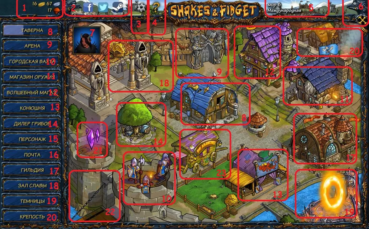 01. 您的资金状态、金币数量以及蘑菇数量【蘑菇为付费货币】。 02. 打开浏览器页面的链接 - 指向开发者页面。 03. 游戏设置【建议进入后勾选“物品对比”选项,这能帮助您更快判断哪个物品更好】。 04. 帮助与支持 - 包含支持论坛链接,您也可以查看条款和规则。 05.在此区域会显示您正在游玩的服务器。 06. 点击此按钮可将操作窗口返回上一级,直至打开城市广场。若已打开城市广场,点击叉号将退出游戏并返回账号选择菜单。 07. 您的角色头像(仅在主广场显示),点击后可进入您的角色个人资料。 08.09. 竞技场 - 在这里你可以与其他玩家进行战斗。 10. 城市岗哨 - 如果你决定暂时不玩游戏,可以让你的角色在你离开期间去岗哨赚钱。 11. 武器商店 - 这里出售战斗装备和武器。 12. 酒馆 - 在这里你可以接受任务,或者与某位顾客进行金钱赌博游戏来试试运气。魔法商店 - 此处出售魔法首饰和药水。 13. 马厩 - 在这里你可以购买坐骑,坐骑能缩短任务执行时间。 14. 蘑菇商人 - 在这里你可以购买【蘑菇】,这是游戏内的付费货币。 15. 角色 - 打开你的角色窗口,里面会显示你的装备、 inventory(背包)和属性。 16.邮件 - 在这里你可以阅读关于攻击和战斗的消息,还可以与游戏中的好友聊天。 17. 公会 - 在这里你可以创建自己的公会,若要加入现有公会,需在荣誉大厅的公会板块中查找,并在描述中选择【联系公会领袖】功能。 18. 荣誉大厅 - 谁更厉害?在这里了解! 19. 地牢 - 也被称为地下城。 20.要塞 - 当你达到25级时,可以建造自己的要塞并管理领地。 21. 悬浮水晶 - 对你非常有用! 22. 可将你传送至任务菜单。 23. 阿巴乌武博士的传送装置 - 也就是命运轮盘,在这里你每天可以免费获得一次奖励,后续转动轮盘需要消耗蘑菇! 06. 账户选择菜单(绑定邮箱)