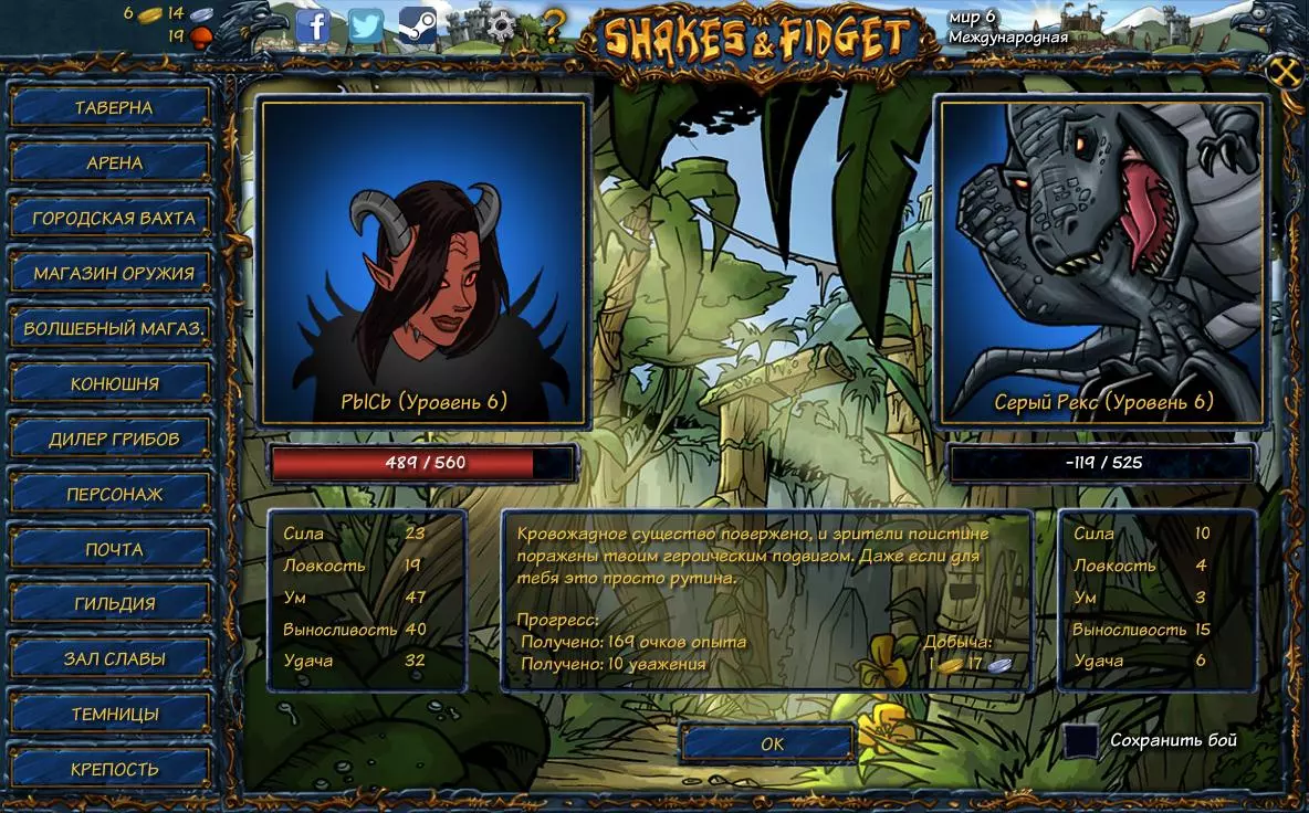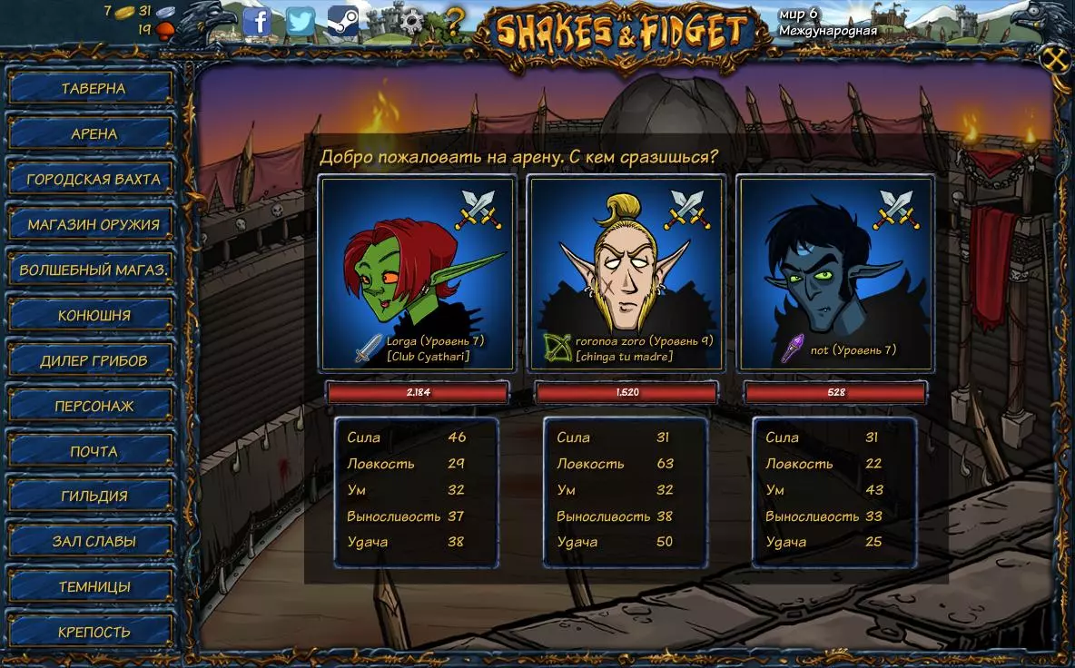 你还会看到一条黄色的“冒险渴望”条,它会在每天开始时完全恢复——这是你执行任务的能量。也就是说,你可以免费完成一定数量的任务,之后需要用蘑菇向酒保购买,而且酒保在任务能量补充数量上有限制。如果你长时间没有提升自己的属性也没有穿戴装备,那么在达到一定等级时,你可能会在任务中遇到怪物——在那里你可能会失败并且无法完成任务。 08. 竞技场