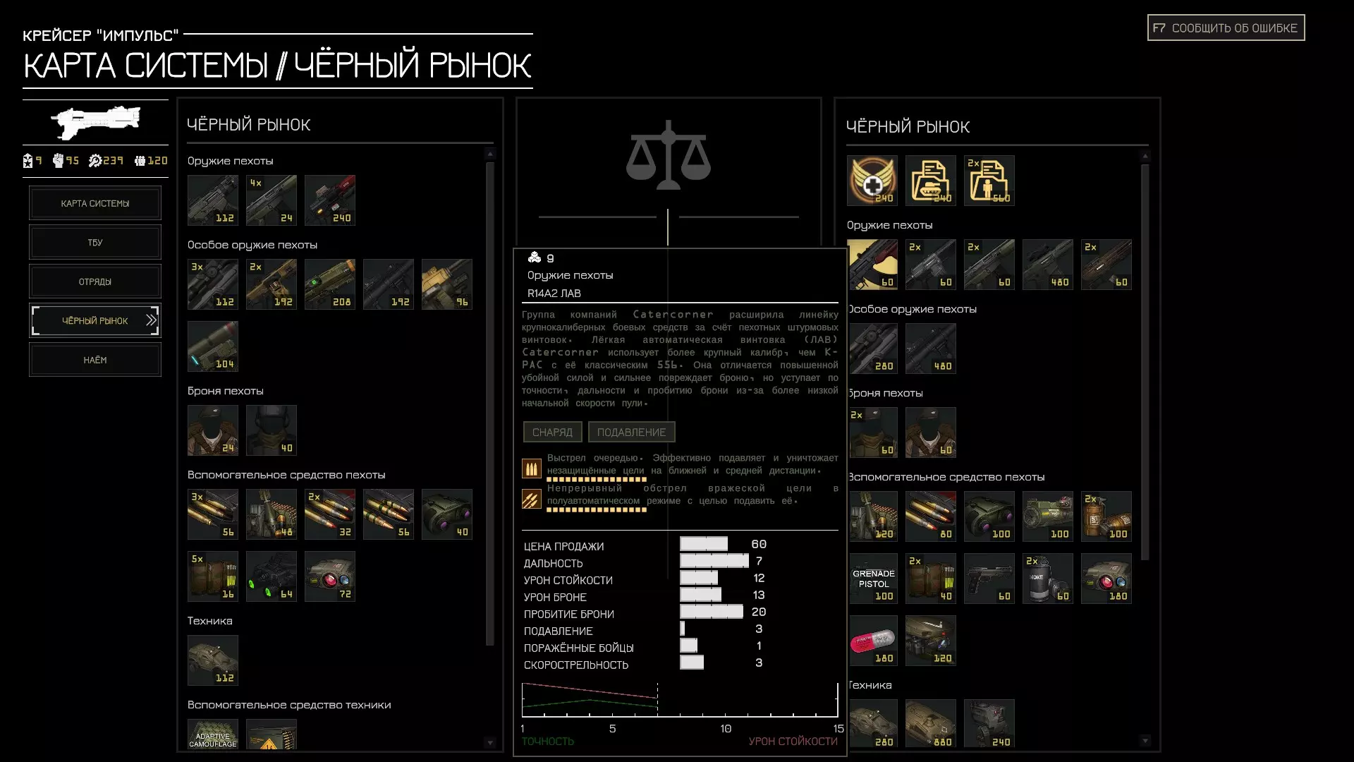 Ахиллеас очень хорош по статам, но стоит очень дорого и обладает плохими навыками, своих денег он не стоит. Краткий обзор пехотного снаряжения Весь спектр пехотного снаряжения советую посмотреть на сайте разработчиков и самим сделать выводы. https://wiki.hoodedhorse.com/MENACE/MENACE_Official_Wiki Стрелковое оружие1)BR3A3 Kr-BaR "Crowbar" убивака самая универсальная и легкодоступная винтовка в игре. Отлично сочетается с экспансивными боеприпасами и отлично убивает все с броней 40 и менее. 2) BR6A1 HaMER Улучшенная версия убиваки, отличная винтовка. 3) R14A2 ARC Базовый автомат, хорош против жуков на короткой и средней дистанции, если у вас плохой стрелок, она будет эффективнее убивает против ксеносуществ, но против всех остальных противников не советую 4)XL1A14 Уникальная лазерная винтовка, с наибольшим пробитием брони. Отлично себя показывает против бронированной пехоты, советую покупать ее на черном рынке, брать в награду за задание или пытаться выбить как трофей со спецназа мятежной армии. 5)MK22MOD1 Уникальная винтовка с наибольшим уроном в игре по стойкости в 30 единиц. Хорошо сочетается с бронебойными или целевыми боеприпасами. Особое оружие1) Снайперские винтовки. В уничтожении небронированных целей уступают обычным винтовкам из-за скорострельности и невозможности стрелять без размещения. В уничтожении легкобронированных целей уступают тяжелым пулемётам,автопушкам, пулеметам и даже обычным винтовкам. Низкая скорострельность, малый боезапас и необходимость размещения перед стрельбой делают их почти бесполезными. Единственное исключение - Anti-Material Rifle 'Crocodile', так как она может уничтожать легкую технику на большой дистанции, но профильные противотанковые средства справляются с этой задачей эффективнее. 2) Пулеметы Отличное основное оружие для малых отрядов. Даже отряд из 3 человек может обладать неплохой огневой мощью благодаря пулемету, отлично сочетаются с тяжелой броней. -легкие пулеметы неплохо подавляют пехоту и уничтожают легкобронированные цели -тяжелый пулемет м6 способен эффективно уничтожать тяжелую пехоту и жуков воинов/стрелков. Хорошая дальность, скорострельность, урон и пробитие 3) Автопушка Отличное дополнение для обычного стрелкового вооружения, уничтожающее легкую бронетехнику и тяжелую пехоту 4) ПТ гранатометы Эффективны для уничтожения техники, но не очень универсальны. Берите, если нужно пробивать броню, а БТРа с танковой пушкой и пехоты с автопушками у вас пока нет. 5)Огнеметы и противопехотные гранатометы я не использовал и ничего говорить про них не буду, но с уничтожением пехоты и без того неплохо справляется стрелковое оружие, а АГС на технике намного мобильнее и эффективнее сдувает пехоту в укрытиях. 6) лазерное оружие тоже можно использовать для уничтожения бронированных целей, но я не использовал и говорить о том, в чем вообще не разбираюсь не буду. -лазерная пищаль неплохо уничтожает технику и ее можно затрофеить у пиратов. 7) минометы абсолютно не наносят урона, но могут использоваться для задымления и подавления, но я не использовал Броняhttps://wiki.hoodedhorse.com/MENACE/Armor Вся Броня очень дорогая по снабжению и никакая Броня не даст вам абсолютной защиты Любой отряд в чистом поле - мертвый отряд. Броня менее 30 очков прочности не защитит вас ни от чего и берется чтобы сэкономить очки. -егерская броня даст дополнительную маскировку и дополнительный 