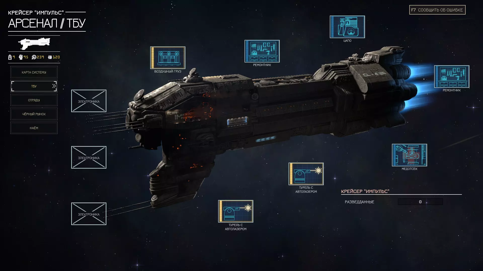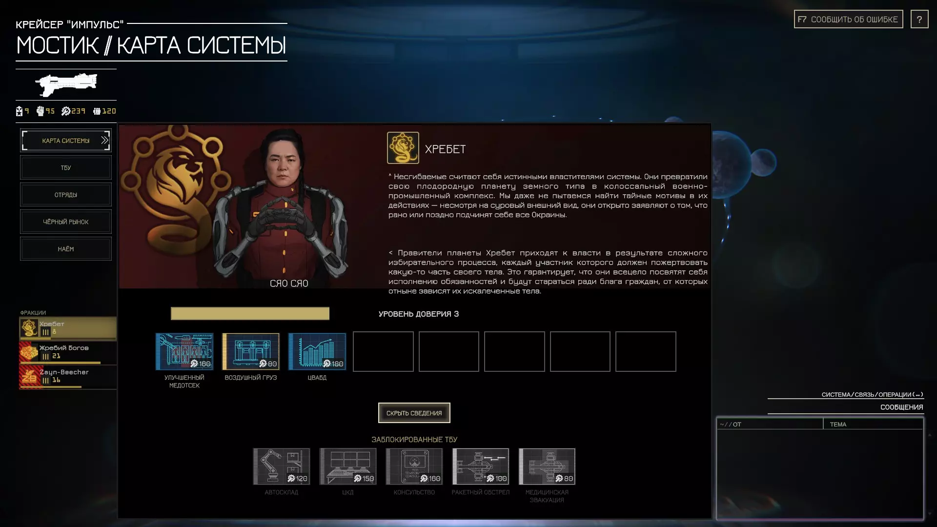 左下角显示与3个游戏阵营的关系,点击后将打开与它们的互动面板,该面板可用于解锁舰船的独特强化。对于每个阵营,你可以提前查看所有可用强化,并决定自己具体想要什么。 待补充