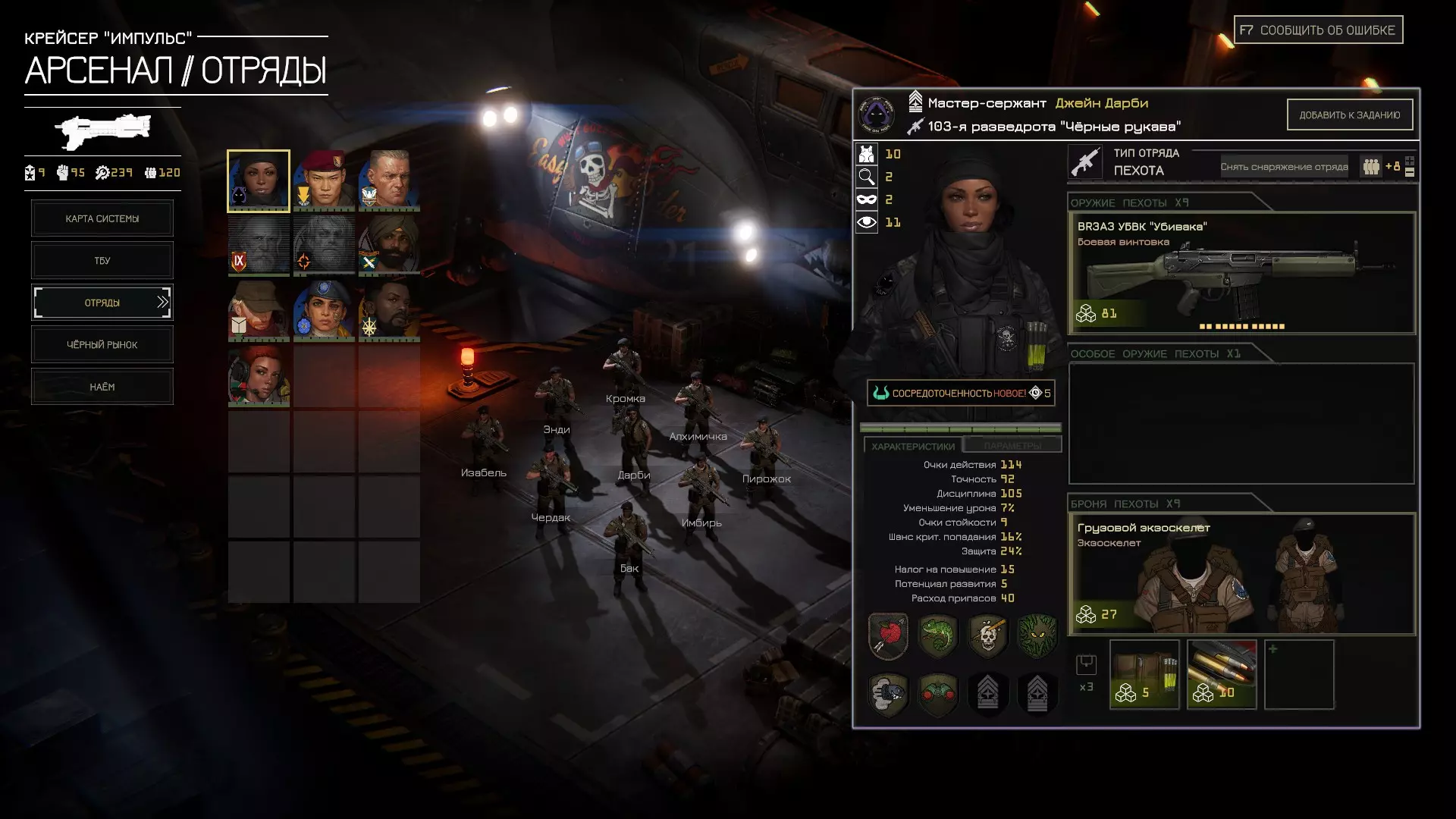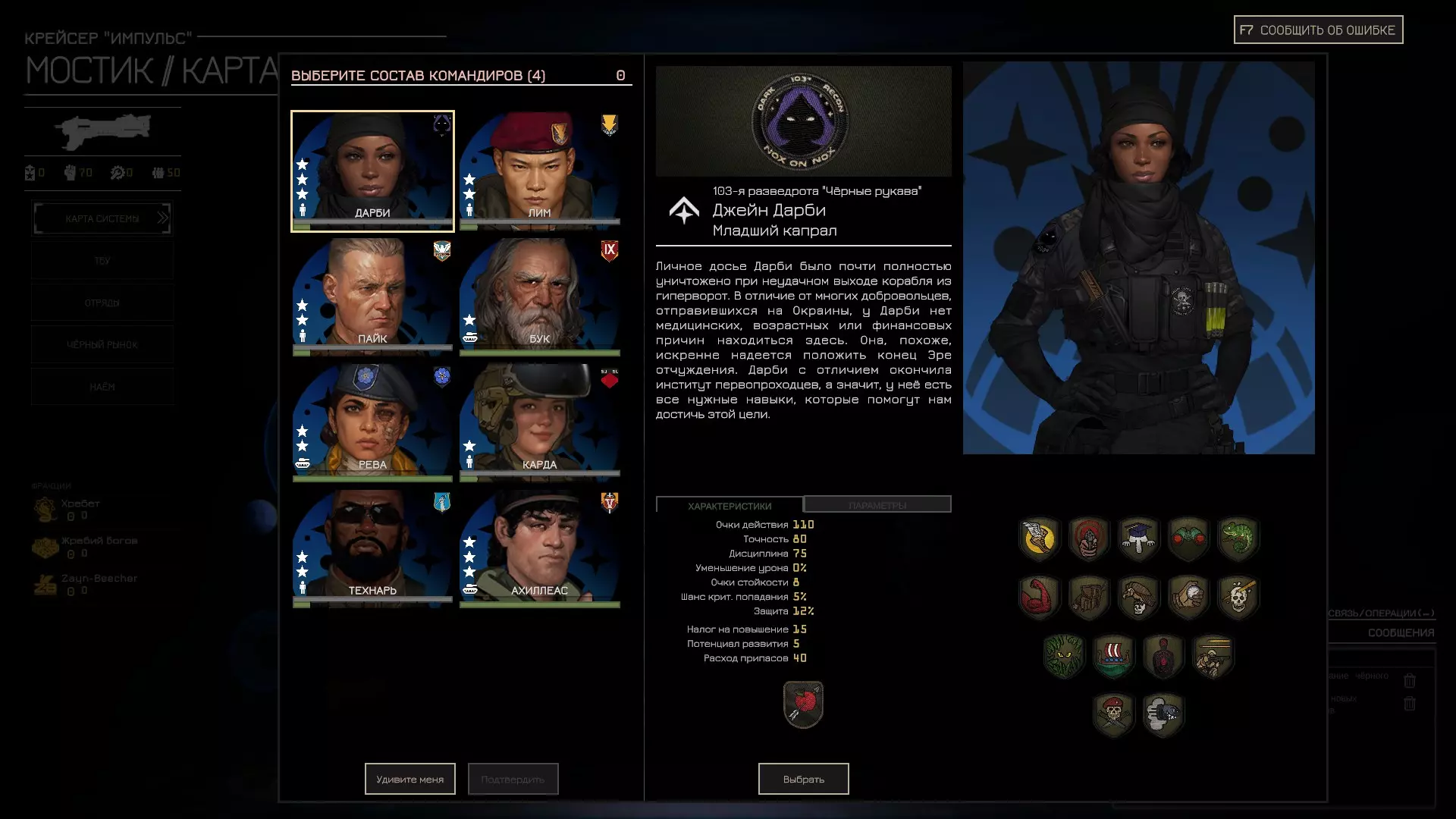 Вам необходимо выбрать 4 командира из представленных 5 пехотных и 3 танковых лидеров, отличающихся иконкой.Рекомендуемое начало - 3 пехотных и 1 танковый командир или 4 пехотных командира. К тому же персонажи делятся на 3 уровня по стоимости снабжения и стартовым характеристикам. Пехотные командиры 1) Дарби - один из 2 сильнейших пехотных отрядов в игре. Самые высокие стартовые характеристики и самый универсальный и сильный набор навыков(ее базовый навык относительно бесполезен) среди пехоты за очень большую стоимость снабжения. Рекомендую брать во всех кампаниях, так как условному Лим с казалось бы высоким потенциалом роста будет достигать уровня только ее стартовых характеристик 15-20 операций, что невероятно дорого, а таких же сильных навыков у большинства наемников и вовсе никогда не будет. Рекомендуемые навыки:разведчик, хамелеон,засада, невероятный выстрел. Остальные навыки тоже хороши, но зависят от вашего стиля игры, а без этих 4 данного персонажа представить сложно. 2) Лим - сильный персонаж с хорошими характеристиками, отличными навыками за среднюю стоимость. Не обладает уникальными бонусами на урон, но отлично справляется с разведкой и ведением боя в движении. Рекомендуемые навыки:разведчик, бей беги, сосредоточенный огонь, берсерк и зиг-заг. Благодаря ним он сможет очень быстро менять позицию и стрелять в движении без размещения,эффективно уничтожая легкозащищенных противников. 3) Пак - хорошие стартовые характеристики за среднюю цену. Набор навыков не позволяет сделать из него хорошего бойца, но он обладает уникальными навыками поддержки(базовый навык на +40 од союзному отряду, бонус в +15% точности соседним отрядам, и навык убирающий подавление с союзника) - с навыком разведчик может использоваться как боевой юнит с хорошими характеристиками, но без уникальных навыков -может использоваться вообще без прокачки минимальным отрядом для усиления союзных отрядов своей базовой способностью. -может использоваться как уникальный юнит поддержки. 4) Карда - худшие возможные стартовые характеристики, но почти бесплатно по снабжению. Хороший базовый навык на точность. Неплохой набор навыков для расчета тяжелого оружия(автопушка, тяжелый пулемет, ПТУР и т.д.), уникальный навык поддержки "командная работа". Играбельный персонаж за свою очень низкую стоимость, но пусть вас не обманывает ее высочайший потенциал роста, вам придется пройти с ней половину игры, чтобы она догнала по характеристикам то, что вполне обычные персонажи имеют с момента найма. 5) Технарь - хорошие навыки, средняя стоимость снабжения. Уникальная живучесть и хороший набор навыков. Если вооружить его хорошим ручным пулеметом и экипировать хорошей броней, то при минимальной численности отряда он будет обладать выдающейся живучестью и сможет на бегу подавлять противников огнем из пулемета. Навыки: вам пригодится сосредоточенный огонь(чтобы точнее стрелять из пулемета не будучи размещенным), зиг-заг (если вы собираетесь им активно перемещаться) и оба навыка 4 уровня. Очень узкоспециализированный персонаж, но в своей нише ему нет равных. 6) Бук - отвратительные характеристики за почти бесплатное снабжение. Навык "вторичные запчасти" сокращает стоимость корпуса техники на 30% и позволяет использовать технику даже при жёстких лимитах снабжения. Навыки не бесполезные