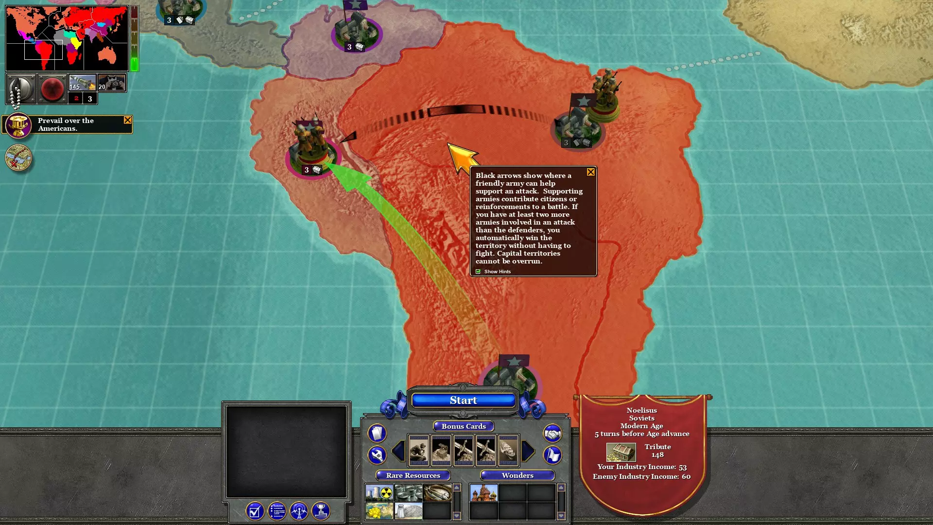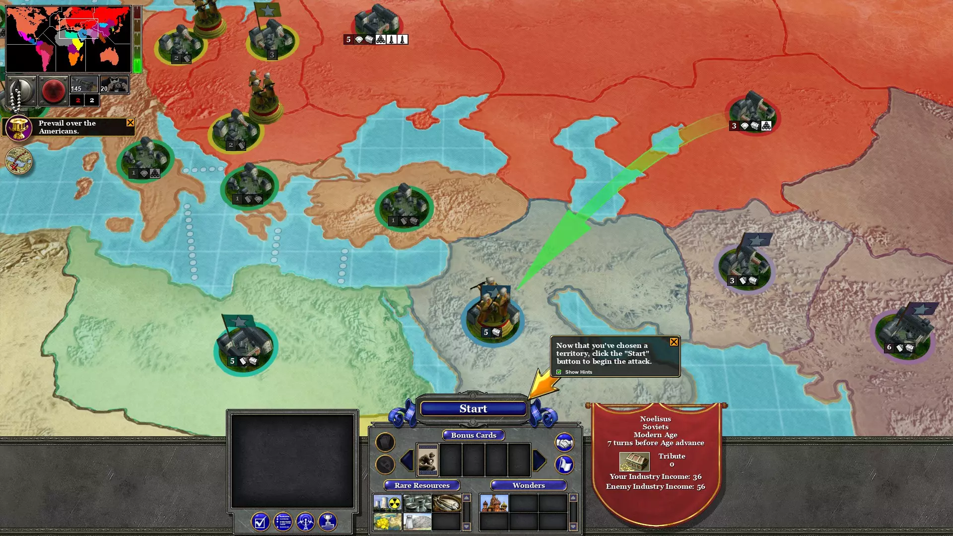 第二回合:资助巴西,解放南非与阿根廷 执行间谍任务以解放南非。之后,升级中西欧的领土强度。