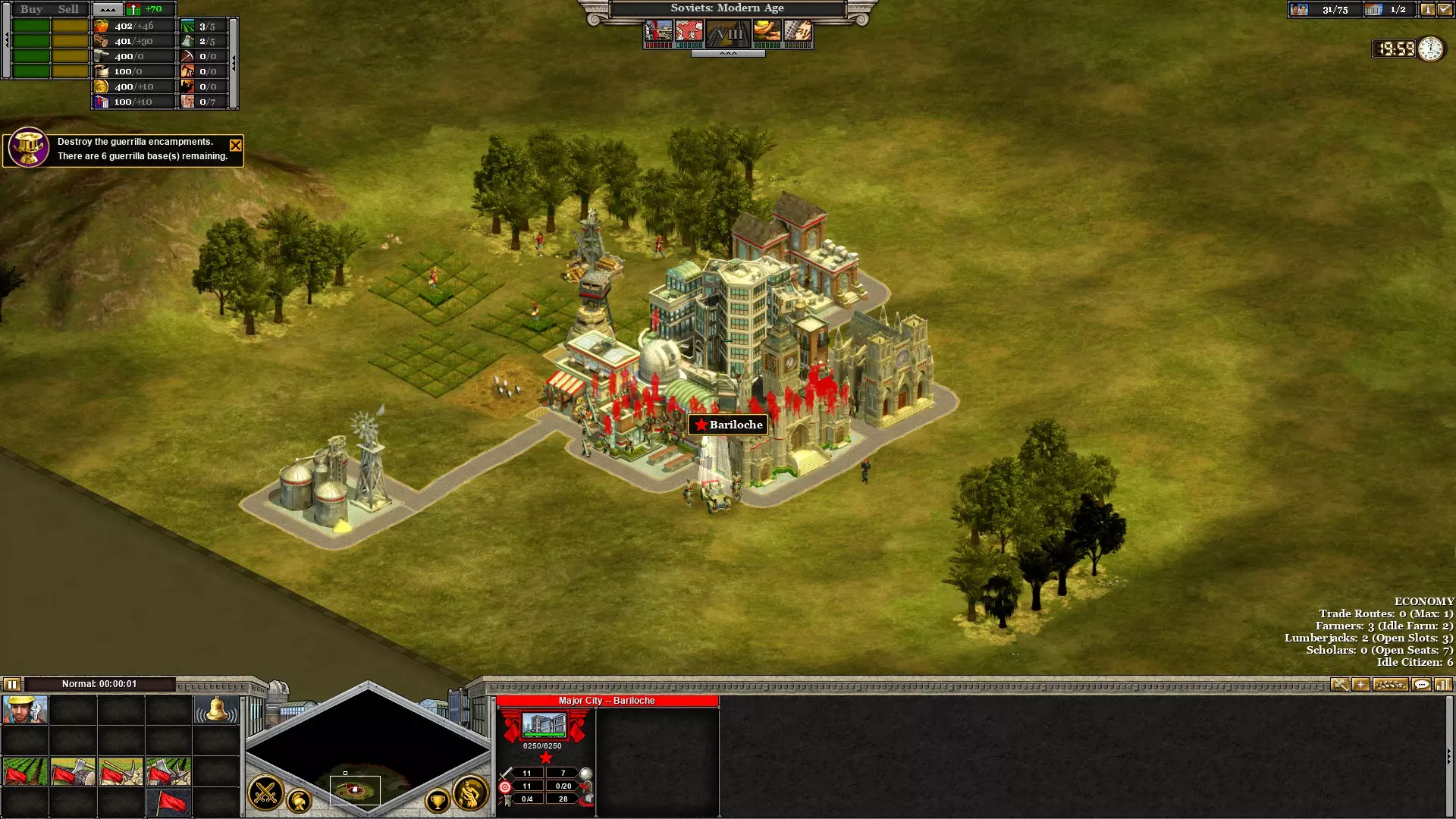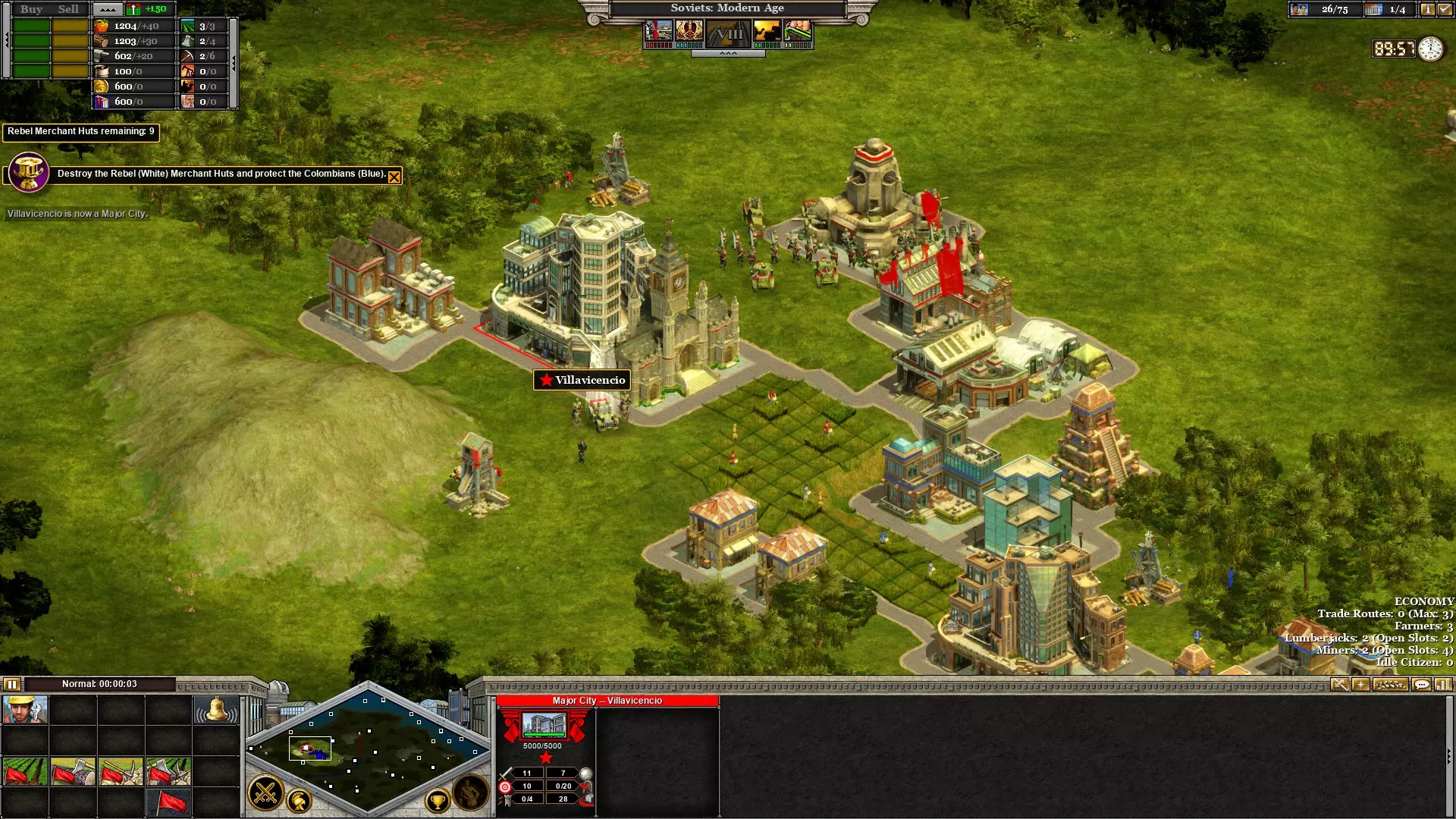 此场景可以当作领土争夺游戏来玩,但很容易被不断增援的军队压制。进行市政研究,建造神庙并升级,然后用初始军队加上2支增援军队碾压剩余的商人小屋。