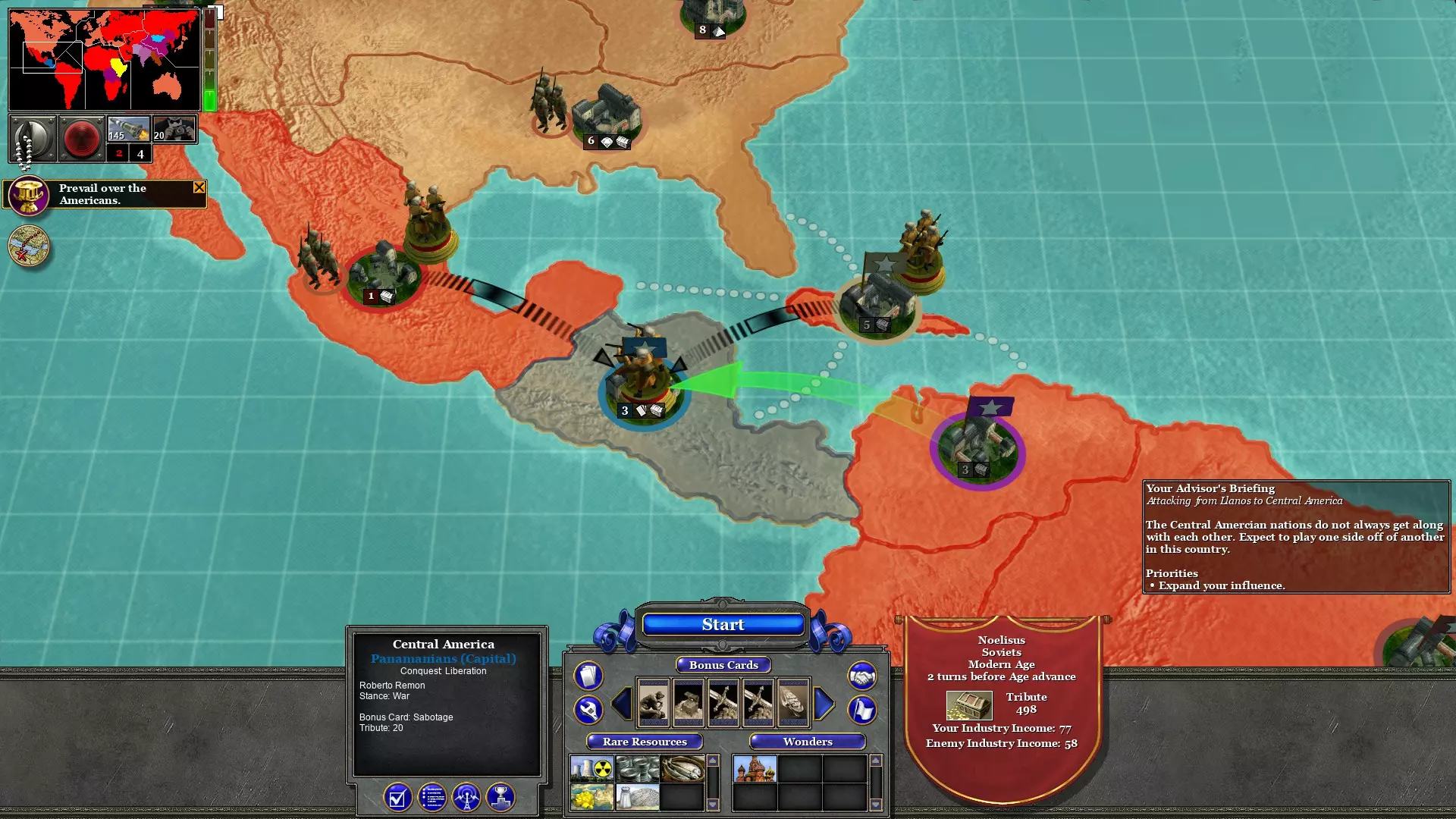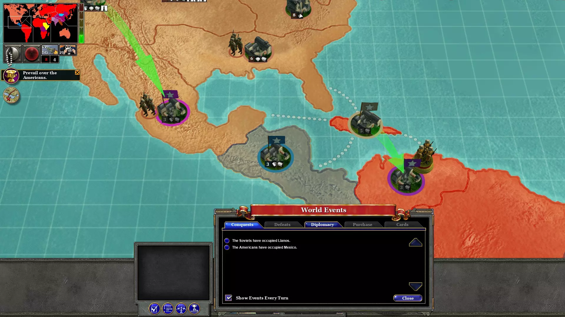 随着墨西哥的解放,拉丁美洲仅剩中美洲这一片区域。派遣军队前往墨西哥和古巴作为增援,并从哥伦比亚发起警察行动。这对于将【巴拿马运河】剧本转变为标准的【解放】剧本至关重要,能显著降低战斗难度。