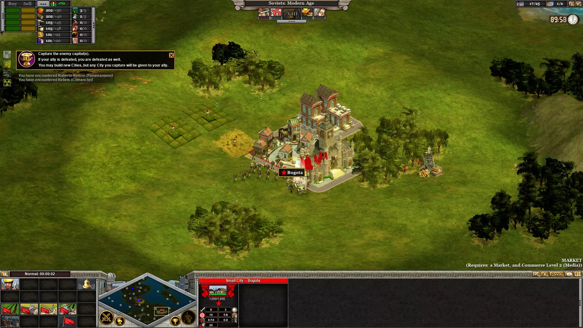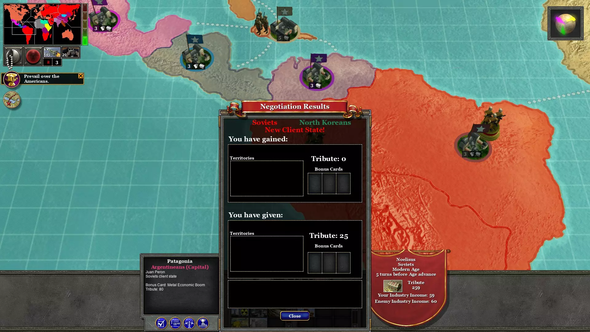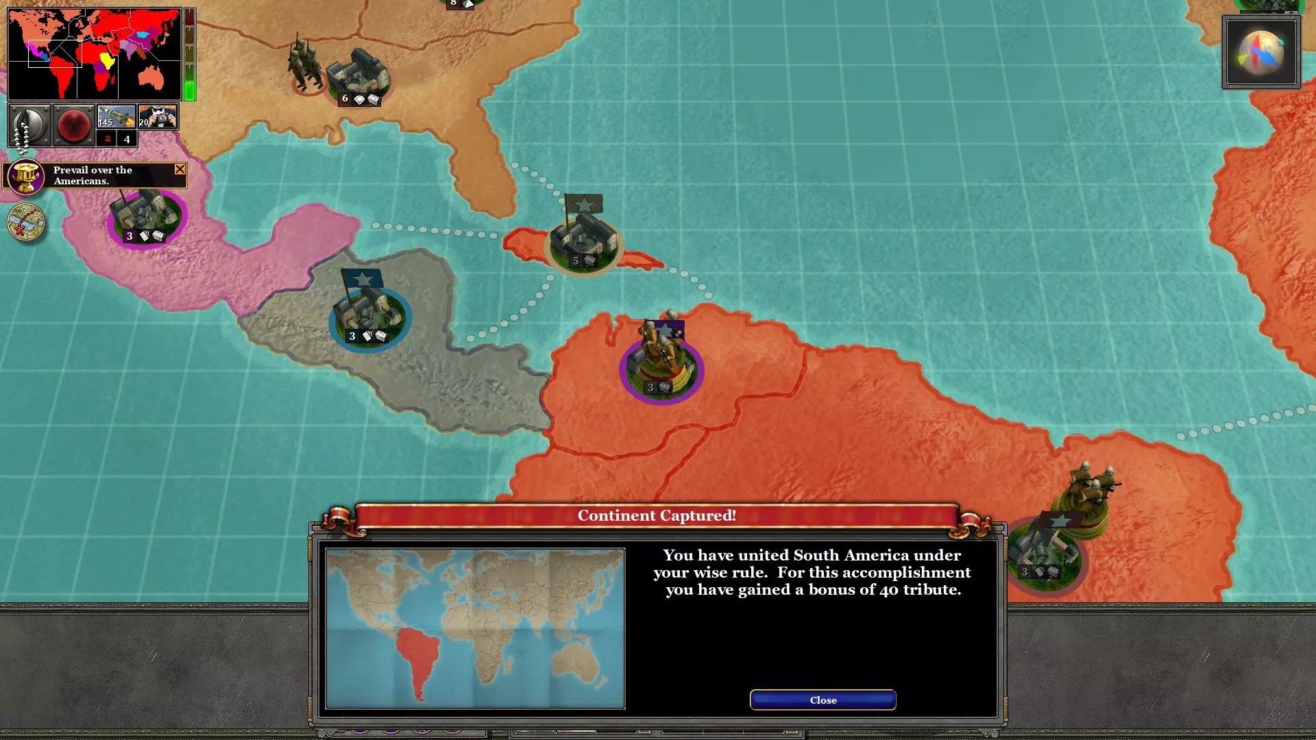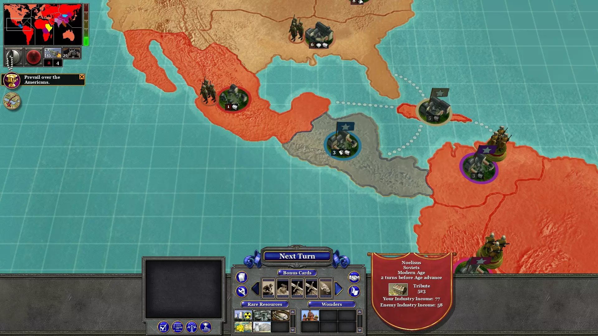 (注意:开发者不慎提供了海军陆战队而非红军步兵) 第六回合:解放墨西哥人和巴拿马人 解放哥伦比亚后,整个南美洲都掌握在社会主义手中!无产阶级为此成就给予我们40贡品的奖励!
