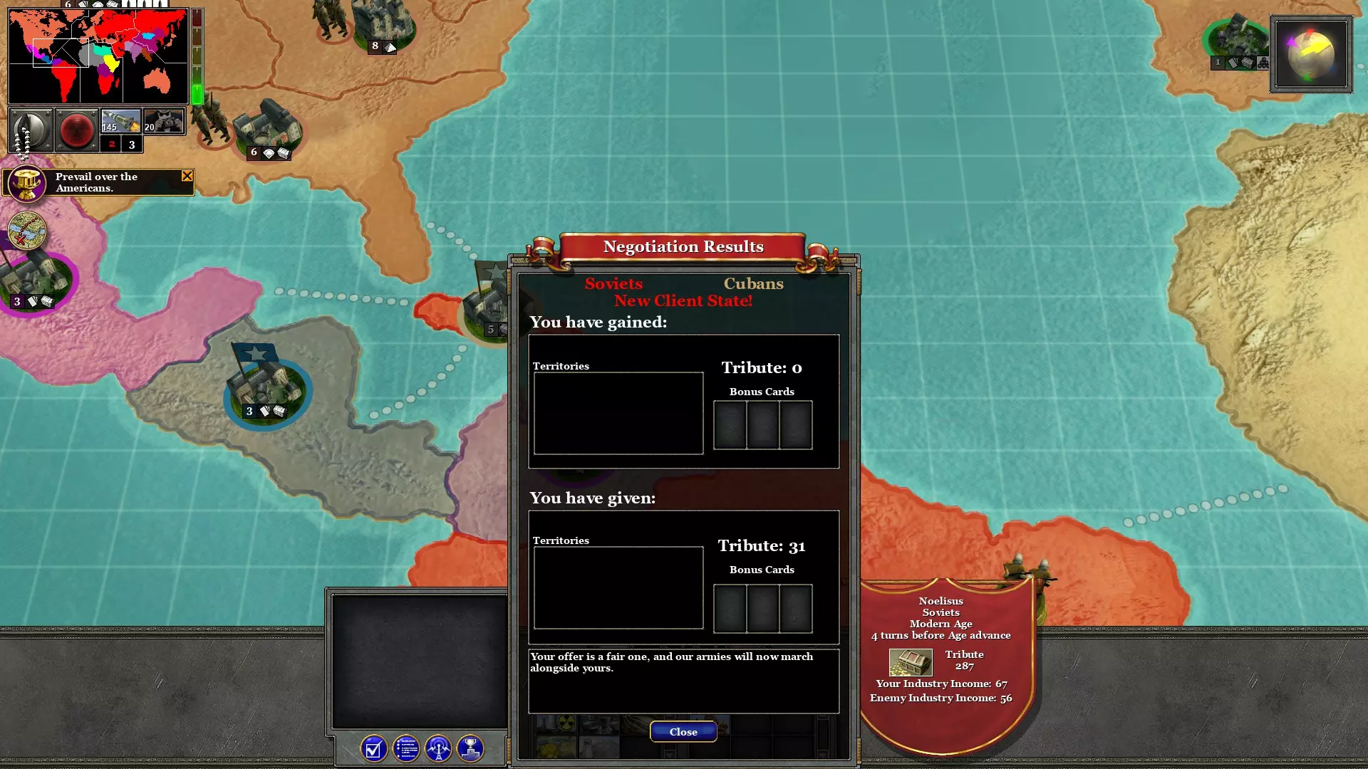 用初始部队袭扰敌人,但不要全面交战。待援军抵达后,再与敌军交战并夺取城市! 第5回合:资助古巴、埃及并解放哥伦比亚人 古巴会提出以100贡金成为附庸国。用31贡金还价,我们的新同志会欣然接受。