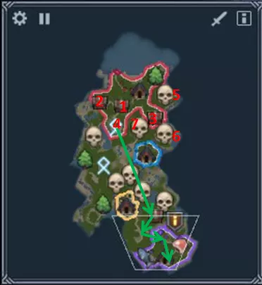 主要任务:击杀位于敌方堡垒区域(灰色电脑标识)的哈根。 额外任务:摧毁乌鸦族的两个小型定居点——地图上的蓝色和黄色区域。每个区域各有两座防御塔!蓝色区域有3名战士、2个盾牌、2把斧头;黄色区域有1名战士、3个盾牌、3把斧头。在这些区域很容易损失己方单位。务必携带持盾单位来承受塔的伤害。在两年期限到来前击败哈根——实际上时间更少,因为在第二年的11月,雇佣兵会前来并摧毁主建筑,所以必须在此之前击败他。 以埃吉尔从未失败的方式完成任务——这是最简单的成就。按理说,埃吉尔的任何失败都意味着需要重新加载存档,所以这个成就应该会自动完成。重要区域 1、2、3、4 - 可殖民区域 5、6、7 - 有狼穴的觅食区域 通关建议 要完成所有成就,需要通关该任务两次,或者从正确的存档点重新加载。 任务开始时,修复所有建筑,但码头除外——我们不需要码头,它只会消耗资源。安排1名居民去伐木场,2名居民去侦查,根据食物数量安排1-3名居民去当占卜师(最多500食物)。逐步探索编号区域,用现有的军队平稳清理它们,并探索废墟。 此时应为其他成就创建一个存档。为了达成在2年内击杀哈根的成就,侦察兵只需沿着地图上绿色箭头指示的方向继续探索区域并清理它们,同时沿途进行补给。如果遇到有7-8个德拉古的区域,可以在军队中添加几把斧头。在你治疗期间,让健康的单位去【5、6、7区域】进行资源采集以获取食物。 一旦探索完所有区域并找到市政厅,要尽快占领一个乌鸦区域,然后立即从该区域进攻【哈根】。不需要占领市政厅所在的区域,只需击败哈根即可。如果此时有雇佣兵来袭,将该区域内所有平民单位聚集起来,带着他们四处移动,确保在击败哈根之前不要被消灭。为了达成其他成就,我们加载存档,带着6名战士静静等待冬季。一旦听到佣兵发动攻击,就扩充军队并进行防御。冬季过后,侦查蓝方和黄方的剩余领地,小心地将他们击败,尽量避免损失单位。此时无需着急。击败黄方和蓝方后,进行休整,集结军队,然后去击败哈根。如果你的单位在突袭中被消灭,你可以从容地从敌人或周边盟友那里夺取黄金(别忘了为此获取技能),并在治疗伤势和储备食物后招募新的士兵。 第六章 - 介入
