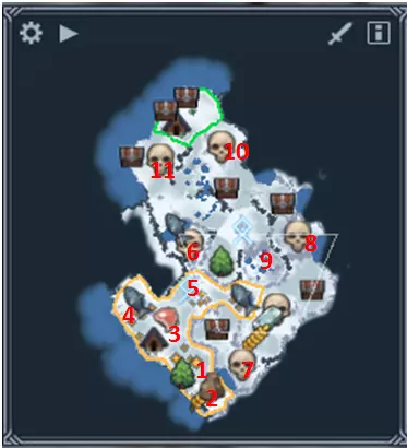主要任务:我们需要殖民8个区域,积累200声望(随着战役进程自动完成),并清理10号和11号区域的狼穴。 额外任务:积累6点幸福值——简单任务,最容易通过建造仓库以及借助斯堪的纳维亚人来完成。 摧毁所有狼穴——狼穴位于6号、7号和8号区域。殖民这些区域即可完成任务。与哈尔瓦德同时在两条贸易路线上交易木材和食物,每种资源的交易时间需不少于1个月——需要在两个不同的区域建造2个贸易站,并与哈尔瓦德进行为期一个月的木材和食物交易。这并不困难。重要区域 1 - 3只狼和森林 2 - 4只狼、小麦和35块石头 3 - 3只狼和鹿 4 - 4只狼和鱼 5 - 4只德拉古(打开区域后2只会冲向你,2只留下) 6、7、8 - 有狼穴的区域,用于殖民以完成额外任务 9 - 沼泽区域,无法殖民 10、11 - 有狼穴的区域,用于主线任务 通关建议 首先用侦察兵按1、2、3、4的顺序侦察这些区域,然后让他们回家。不要急于探索5号区域,因为那里会有两个德拉古(Draugr)冲出来,可能会给你带来很大麻烦。 探索之后,用布兰(Brand)清理1号区域,进行殖民并建造锯木厂,之后再建一个训练营。接下来,用士兵/萨满依次清理2号、3号和4号区域。建议在这些区域安顿下来,度过冬天,在继续前进之前积累一些资源。可以在继续前进之前开采所有矿石,以节省资源并合理利用劳动力。 探索5号区域时,会有敌人袭击,击败他们并殖民该区域。探索5号区域右侧后,你会遇到哈尔瓦德,可以与他进行交易,从而完成支线任务。殖民所有可能的区域,尤其是6、7和8号区域,以完成支线任务。遗憾的是,您的扩张将被【9号沼泽】阻挡,这片区域您无法进行殖民。 继续平稳向【哈尔瓦尔德】推进,清理沿途区域,并在自己或盟友的领地内通过治疗者进行恢复。不必担心他,没有您的帮助,他也肯定能存活6-7年。不要忘记关于幸福度的额外任务。在这个任务中,我使用1名英雄加4名斧头兵就足以清理整个地图。第三章 - 定居点