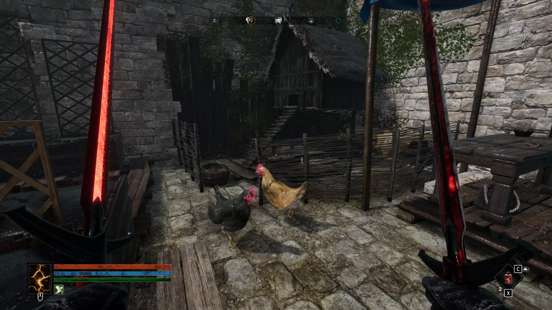 4 通往海底深渊的传送门 建议立即前往此地并获取破碎的铜锣。这也是解锁成就The Keeper of the South以及安全取出王者之剑所必需的。 5 塞留克和他的特殊宠物 在城堡西墙附近有一个不起眼的小菜园,一位勤劳的农夫和他的鸡群就住在这里(其中一只鸡将来会引起我们的特别关注)。