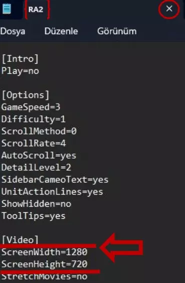 设置《红色警戒2》《红色警戒2:尤里的复仇》和DDrawCompat文件。 编辑上一部分中第二张图片标记的每个文件时,我们右键点击并选择用记事本编辑选项。首先,打开RA2文件,将ScreenWidth=1280和ScreenHeight=720部分设置为1280x720分辨率,点击文件名旁的叉号关闭并保存更改。