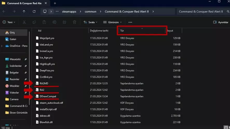 然后我们访问了游戏的本地文件。要按类型对文件进行排序,我们点击标有“类型”的位置。我们已准备好设置RA2、RA2MD和DDrawCompat文件。