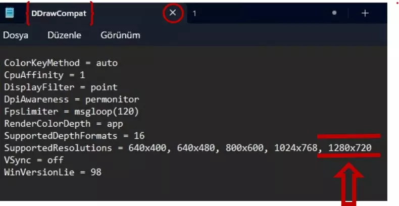 最后,我们打开DDrawCompat文件,在“SupportedResolutions = 640x400, 640x480, 800x600, 1024x768”的右侧添加“,1280x720”,然后点击窗口上的叉号关闭文件并保存更改。