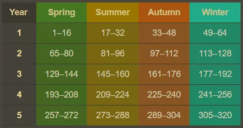 每个存档的第一天均为春天第一天。春天时,草地会在没有树木的土地上自动生成。在冬天到来前,草地能在连续(不被桥梁、森林隔断)的区域蔓延。同时,兔子和鹿开始出现,农田也可投入生产。 夏季除外观不同外,与春天的区别仅在于草地不再自动生成,只能从已有草地的连续区域开始蔓延。 秋季外观上草地会变黄,临近秋季末尾时水面会出现浮冰。其他方面与夏季相同。 冬季提示:这段时间很难获得收入。建议前期快速通关至四岛解锁铁科技,冬季返回前面的岛屿发展、炸洞。 冬季开始下雪,草地消失,农田停止生产(此时未成熟的作物会枯萎)。兔子和鹿停止生成。但是野外开始生成浆果丛,可以在浆果丛处花费1金币让农民来采摘浆果生产金币。同时野外出现一个野猪窝,刷新强力敌对生物野猪。击杀野猪后获得约30枚金币。一个冬季只会刷新一只野猪。 建筑 注:0级表示初始状态。 基地中心0级