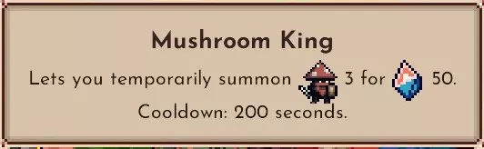 通称蘑菇 蘑菇王拥有第四个技能 可以用50水晶召唤3个蘑菇。 在斯佩拉斯中水晶会自动积累,刚好从第一波到第二波就能积累50个并使用。这是神级调整。 如果搭配其他国王使用,需要和后文提到的智慧树一起使用。 蘑菇的兵种是战士和奥术师,所以训练效果要与此匹配。 增加175%生命值也不是梦想。 奥术师的攻击速度提升效果如果叠加起来,强度也不容小觑,所以如果和蘑菇生产设施一起使用,排列10个蘑菇并在后方排列魔法师的话会相当强。 智慧树