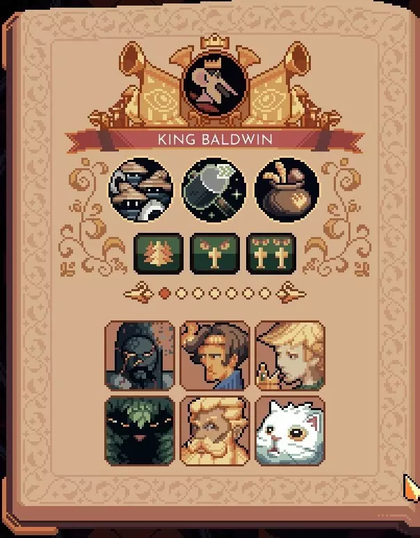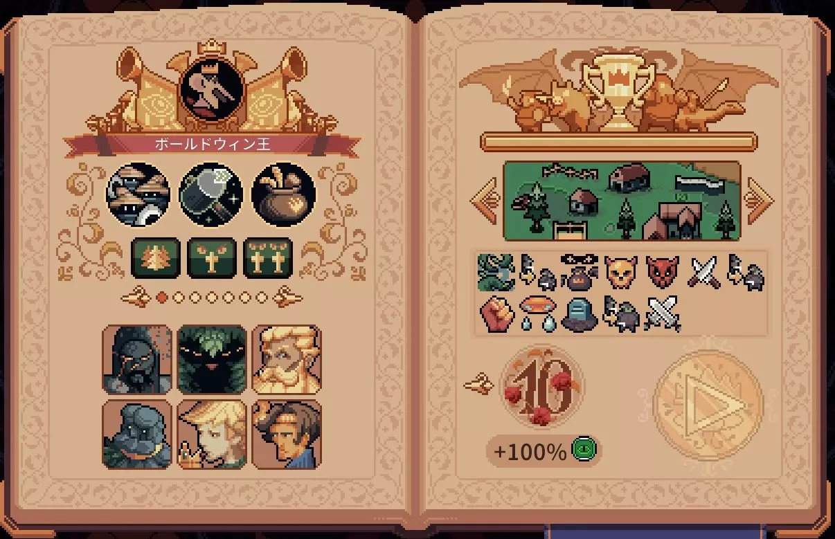 如果已经攻略到威胁度9,相信您大致理解了各种符号的含义,因此这里仅说明与威胁度9的区别。 与威胁度9相比,威胁度的变更点如下: 1. 解除设施的重新布置限制 2. 敌人生命值额外提升50%(累计提升120%) 3. 敌人攻击力额外提升60%(累计提升90%) 其他负面效果仍处于累积状态。 初始波次的敌人已变为仅靠农民完全无法抵挡的怪物群,因此需要运用坦克角色或技能进行清场等手段,在前往 boss 的途中进行升级和资源生产。 关于无尽模式的攻略,计划另作指南。由于几乎所有国王都采用类似的战术,游戏玩法容易变得单一,因此本指南将省略针对无尽模式特定手法的说明。 各国王的顾问组合示例 鲍德温