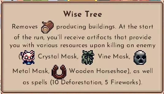 限制玩法指南其一 树木生产设施不再出现,击败敌人后会掉落3个水晶、4个葡萄、3块石头和1个木材。相当于初始就持有对应的遗物。 初始会获得10个【Deforestaion】和5个【Fireworks】的法术槽位,因此在【VillageMap】中可以通过法术砍伐树木来少量获取木材。基本上是通过将途中获得的1个通用设施格转换为1000木材格,用于解除单位限制,或者清除初期的负面效果格中的树木,每次可获得50木材,此外还可以通过幕间事件获得锯木厂、通过 artifacts(遗物)供应等方式来获取木材。 由于需要避免使用消耗木材的单位,因此会想采用蘑菇王作为肉盾角色。 这是个相当有趣的顾问,在某些情况下,即使威胁度达到10也可以考虑采用。 贝蒂