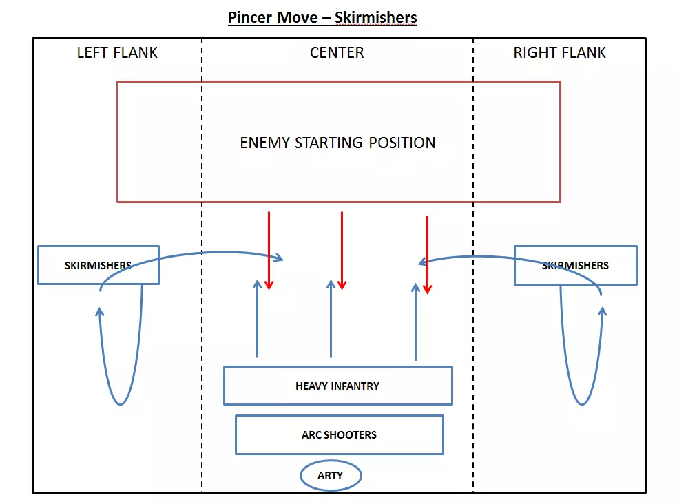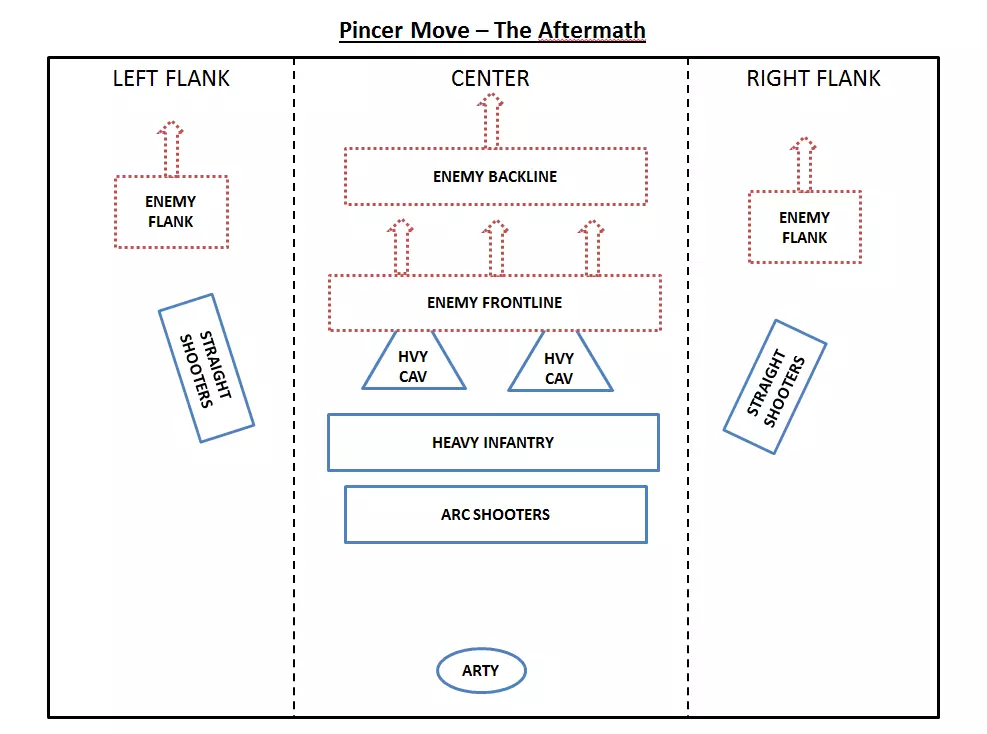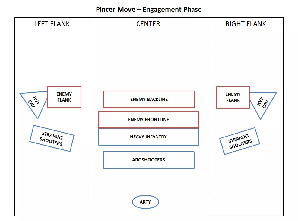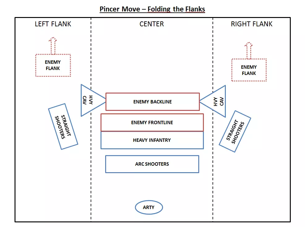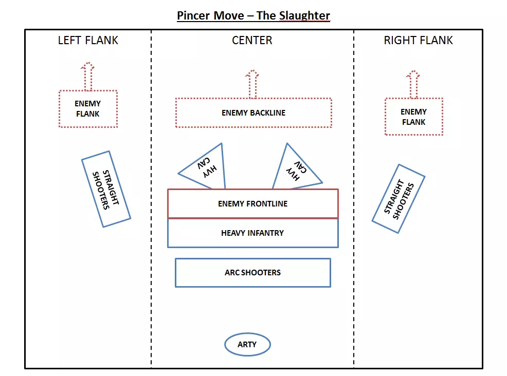 This is when you tell your cavalry to finish off routing enemy elite regiments to maximize casualties. What if... What if one flank can't rout the opposing one in time? Then fold with just one flank, in most cases it will be enough to rout their center. If your front-line holds very well, you can divert some of your back-line shooters and/or arty to help the struggling flank. What if both flanks can't rout the opposing ones? Check your front-line, if the front-line holds very well, divert some of your back-line shooters and/or arty and/or melee reserve to help one or both flanks. What if your center collapses before you won the flanks? That's a crappy situation to be in. Check the following: Is it possible to free some flanking units to fold on the back-line even if the enemy flanks are not routed yet? Do you have reserve melee unit in the back-line that you can send? How's the enemy center? Can your back-line shooters rout them either by a combination of volleys and melee combat? Can your back-line shooters play skirmish (shooting and retreating) with the enemy center to give enough time to your flanks to win and fold? What if your center routs the enemy before your flanks? Then it's not a pincer move :p and you've probably put too much strength in the center and not enough in the flanks. Send help from your center to both flank to rout them as well. What if both flanks and center collapse? You're screwed. Try to regroup your units, create multiple fixation points and pockets of resistance and try to recreate imbalances on the battlefield that you can exploit. It's time for heroic charges, frontal counter charges, skirmish fights and last stands. Theoretically you should lose, you might win, good luck ! What if the enemy flank regroups and counter-attack? I'm looking at you Skavens, Orks and the likes, they flee, regroup and charge or shoot at your back while you are folding the flanks. To prevent it, you can evaluate the strength of the routed units and check if you can spare one or two regiments to make sure they stay routed. Light Cavalry is very good at it. If it happens anyway, it's very frustrating but totally manageable: - Check the potency of the regrouped flank, can you ignore it or not? If you can, then let them shoot and charge and accept the extra casualties if it allows you to rout the enemy army faster - If the potency of the regrouped flank cannot be ignored, cancel the folding on one or both flank for one to all units, rout them for good and fold again. Relationships The following relationships are noteworthy: The strength of a unit is relative to the opposing one. It means that you can have a strong reliable center while using tier one melee infantry if the opposing units will struggle against these. For example, Dwarf Axemen can hold for ages against ork boys and goblin infantry, you don't need Ironbreakers for holding the center in this case. It also means that your flank strength is only relative to the opposing flank, making Dark Elves shades a perfect flanking unit if they are not going to face heavy cavalry for example. The weaker the center, the stronger the flanks need to be: It's all about timing. The center needs to be strong enough to hold the line while the flanks are won. It's a matter of balancing the speed at which the flanks will win against the amount of time the center can hold. The speed of winning the flanks should be faster than the amount of time your center will hold. Those two relationships have the following consequences: You don't need to outnumber the enemy in the flanks, you just need to be able to smash it. Say one of your flank is made out of only 2 Reiksguard regiments but facing 4 skaven slaves regiment, they'll still win that flank. You might need to outnumber the enemy in the center, especially if their center is much stronger than yours. For instance if you face a High Elf army which center is made out of 6 regiments of Hoeth Swordmasters, trying to hold it using 6 regiments of Ork Boyz might not do the job. It is important to always evaluate the strength of each unit relatively to what they will face and therefor the strength of the flanks and center is relative to the opposing strength. Variants There are multiple variants to the pincer move. First of all, it is important to state that you don't need cavalry to accomplish a pincer move neither you need to have symmetrical flanks, it doesn't matter. Stay true to the essential: the pincer move is about winning flanks and folding them while the center holds. I'm going to quickly go through main variants of the pincer move: 1- Heavy Cavalry only on flanks It's the "natural" pincer move. Your heavy cavalry should smash the opposing flanks and smash the backline, as it is theoretically the fastest way to win the flanks, you can afford having a weaker center. 2- Infantry only on flanks It's much slower so it means your center needs to be balanced accordingly. Try to balance infantry and missile units on your flanks. Shooters are actually very efficient flankers: either arced or straight, missile infantry will always do much more damage flanking the enemy than shooting over your own troops. Special mention to hybrid melee/missile troops like Free-Militia, Corsairs, Shades, etc for their great flanking ability... if you can manage any opposing heavy cavalry. 3- Cavalry only on center This one is funny but very tricky and "unnatural", meaning that it's doable but definitely not the most efficient way of using cavalry. However, in some rare cases, it's actually extremely effective. Put your heaviest cavalry in the center and "fix" the enemy front-line using Hit and Run techniques: you charge, you back, you charge, you back etc... while your flanks, either made of infantry/missile/cavalry beat the opposing flanks and fold. I don't advise this technique for newcomers, you need to know exactly what your heavy cavalry is capable of and really master the Hit and Run cavalry technique. In a lot of in