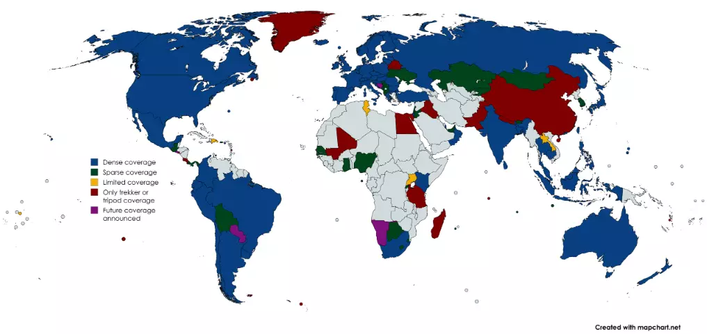 在移动类游戏中,有多种移动操作技巧。最常见的是点击你想要移动方向的道路。你也可以使用屏幕中央的移动箭头,这在移动功能出现异常的回合中尤其有用。最后,你还可以使用W键和S键分别控制前进和后退。当你希望精确地一次移动一个场景时,可以使用箭头键或键盘按键。 你可以通过点击并拖动鼠标来平移视角,使用滚轮进行缩放。或者,你可以使用左下角的缩放按钮。此外,也可以通过A键和D键以及左右方向键来平移视角。在移动类游戏中,左下角还有几个实用按钮。【返回起点】按钮(快捷键R)会将你传送至本回合的初始位置。这在移动类游戏中是非常重要的工具,因为你需要猜测的是初始位置,而非你进行猜测时所在的位置。【设置 checkpoint/返回 checkpoint】按钮(快捷键C)允许你在移动到的位置设置一个检查点,再次按下该按钮即可返回检查点。【撤销移动】按钮(快捷键Z)能让你在移动后回到上一个位置。当你不小心从主路拐进小路,且通过正常移动返回会很耗时的时候,这个按钮尤其有用。将鼠标悬停在小地图上会将其放大,此时你会在左上角看到三个新按钮,分别是两个箭头和一个图钉。你可以使用左上角的箭头来调整小地图的大小。图钉按钮用于锁定小地图,使其在鼠标移开后不会缩小。 当你准备好进行猜测时,可以使用“猜测”按钮或按空格键来确认。 覆盖地图 由于游戏基于谷歌街景,出现的国家将与街景覆盖的国家相对应。了解哪些国家有覆盖而哪些没有是基本常识,因为世界上有些地区,例如非洲和中美洲,在游戏中只有少数国家会出现。