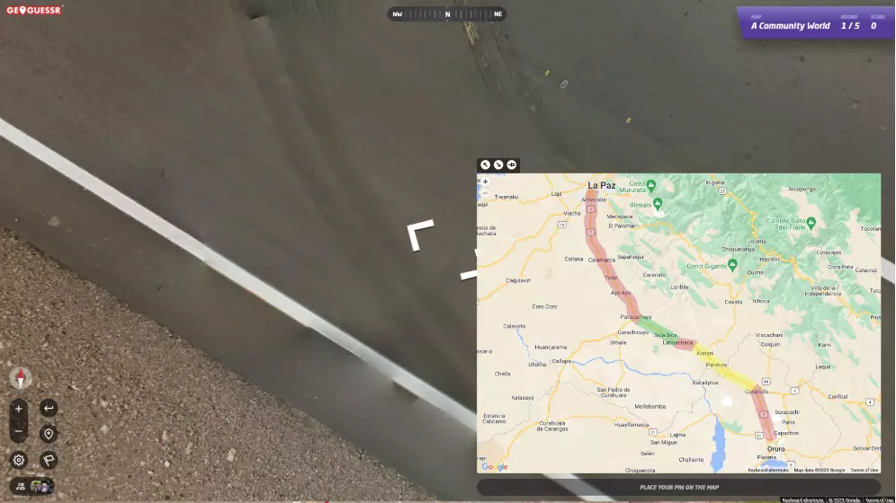 指南针 指南针是精确定位地点的最重要工具之一。了解海岸线、山脉或城市天际线的方向是进行合理区域猜测的基本方法,而知道你所在道路的准确角度对于找到5公里范围往往至关重要。 默认情况下,屏幕顶部会显示指南针,该指南针以你所面向的方向为中心。你可以在设置菜单中开启经典指南针。在经典指南针中,红色箭头指向北方,白色箭头指向南方,方向均相对于你所面向的方向。当你直视东方时,指南针会完全水平,红色箭头指向左方。使用哪种指南针取决于个人偏好。 《地理猜谜》提供同时显示两种指南针的选项,我们建议使用此设置。经典指南针对大多数玩家来说一目了然,更容易读取;而新指南针在尝试对齐道路时能提供更高的精度。 一种常用的确定道路角度的技巧是:直视下方,让指南针精确指向北方。此时地图上的道路应与你屏幕上看到的道路方向平行。道路标线通常是比较角度最简便的方式。