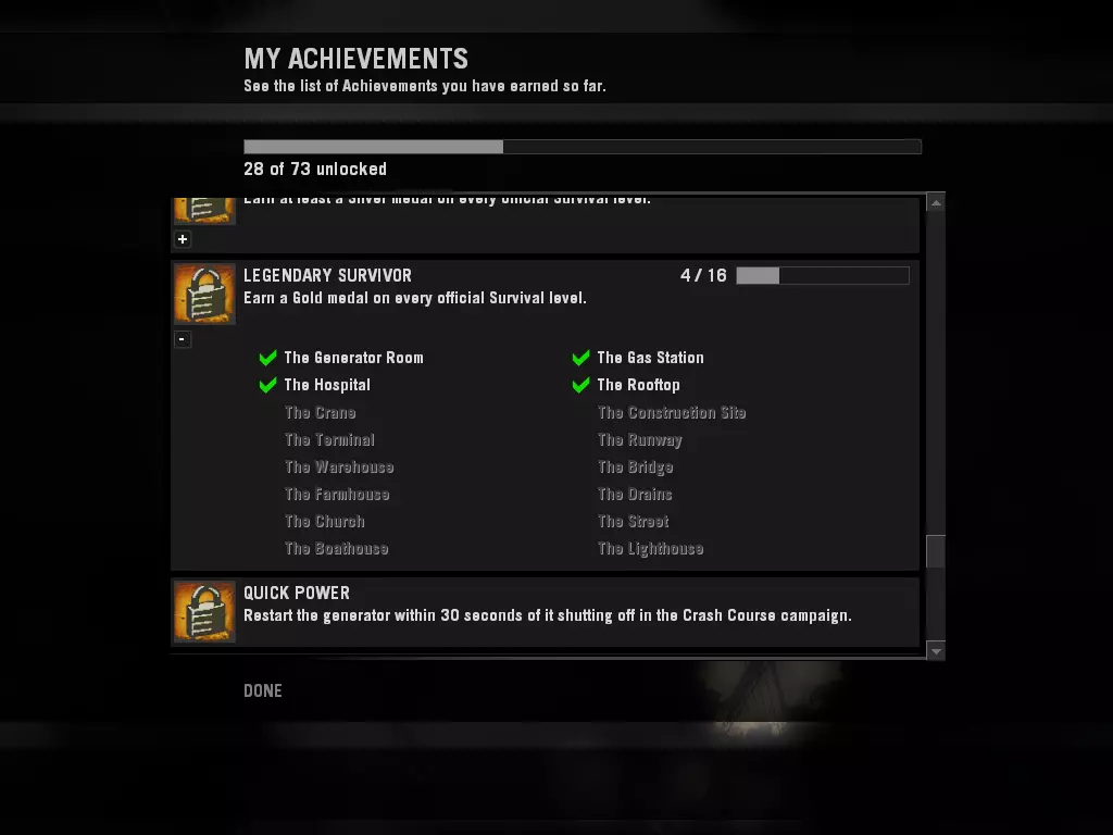 由于没有Steam创意工坊来帮助我们获取那些单人难以完成的成就,而你又对在Steam创意工坊之外的其他可疑网站下载附加组件和模组过于谨慎,本指南将帮助你完成《求生之路》中的部分成就,祝你好运! 0. 简介 目前已经有一些无需下载任何内容即可遵循的指南,因此本指南将专注于其他难以获取的成就。 以下是一些能帮助你完成其他成就的指南,这些成就我不会在这里详细说明如何获取: 【已屏蔽外部链接】 【已屏蔽外部链接】开发者控制台 通过利用开发者控制台,在单人模式下获取成就会变得容易得多,因此请确保在以下路径开启开发者控制台: 选项 > 键盘/鼠标 > 允许开发者控制台 > 启用 1. 传奇幸存者 传奇幸存者是《求生之路》中最难获得的成就之一,因为游戏已经没什么人玩了,而且我们有时没有朋友帮忙,所以要完成这个成就,你需要按照以下步骤进行设置: 步骤1