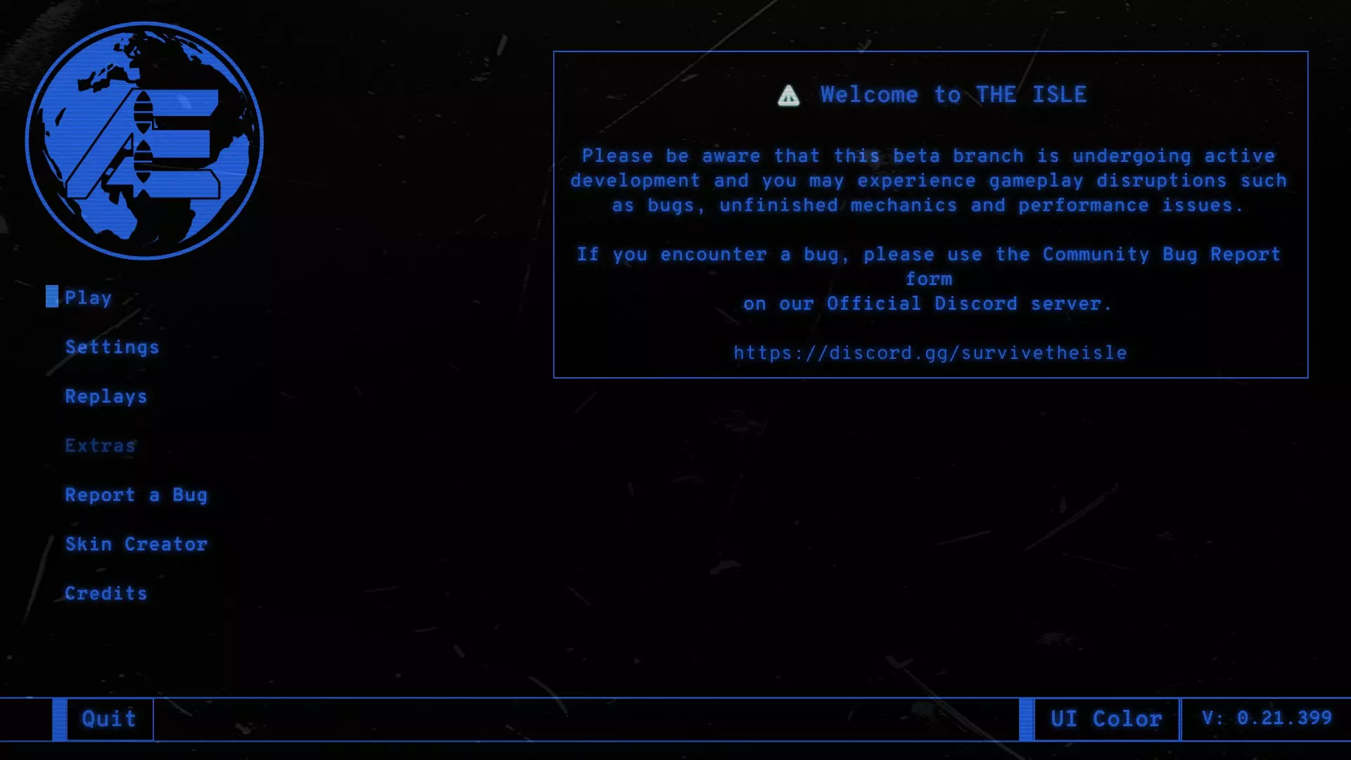 下载完成后启动游戏会出现如下画面,从上到下依次为: Play→进入服务器搜索界面 Settings→进入设置界面 Replays→播放通过F2录制的视频 Extras→无法点击,功能未知 Report a Bug→进入bug报告界面 Skin Creator→进入恐龙皮肤制作界面 Credits→点击无反应,但应该会显示开发者等人员的制作人员名单