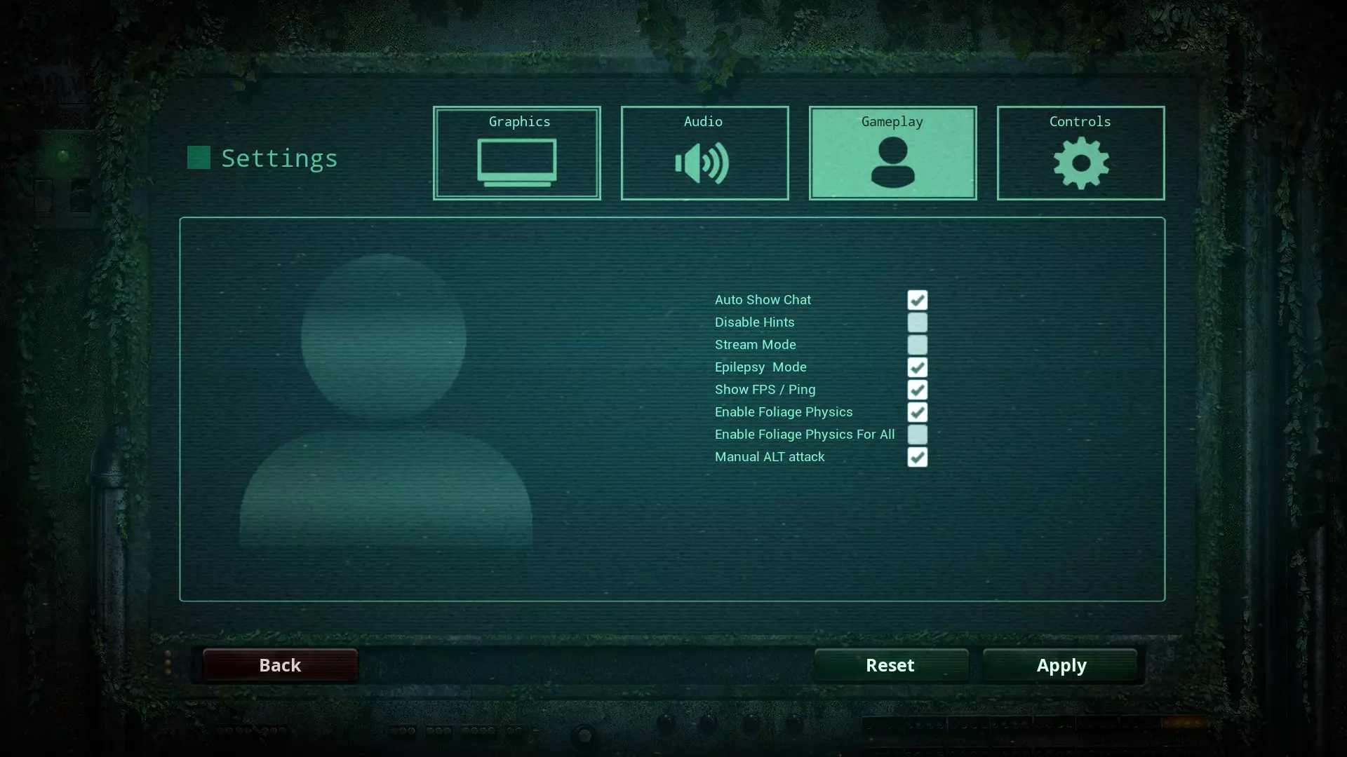 3:游戏玩法设置 关闭“Disable Hint”选项,否则饮水提示等内容会消失。 必须开启“Manual Alt Attack”选项。若关闭此选项,名为“Alt攻击”的技能(会自动转向面向方向发动攻击)将被设为普通攻击。但该攻击后摇较大且消耗耐力,连续使用存在风险。 开启“Manual Alt Attack”后,默认攻击将设为普通攻击,而Alt攻击需通过长按左Alt键+左键点击发动。 “Foliage”相关选项用于更改草丛的物理碰撞判定,可根据电脑配置决定是否开启。