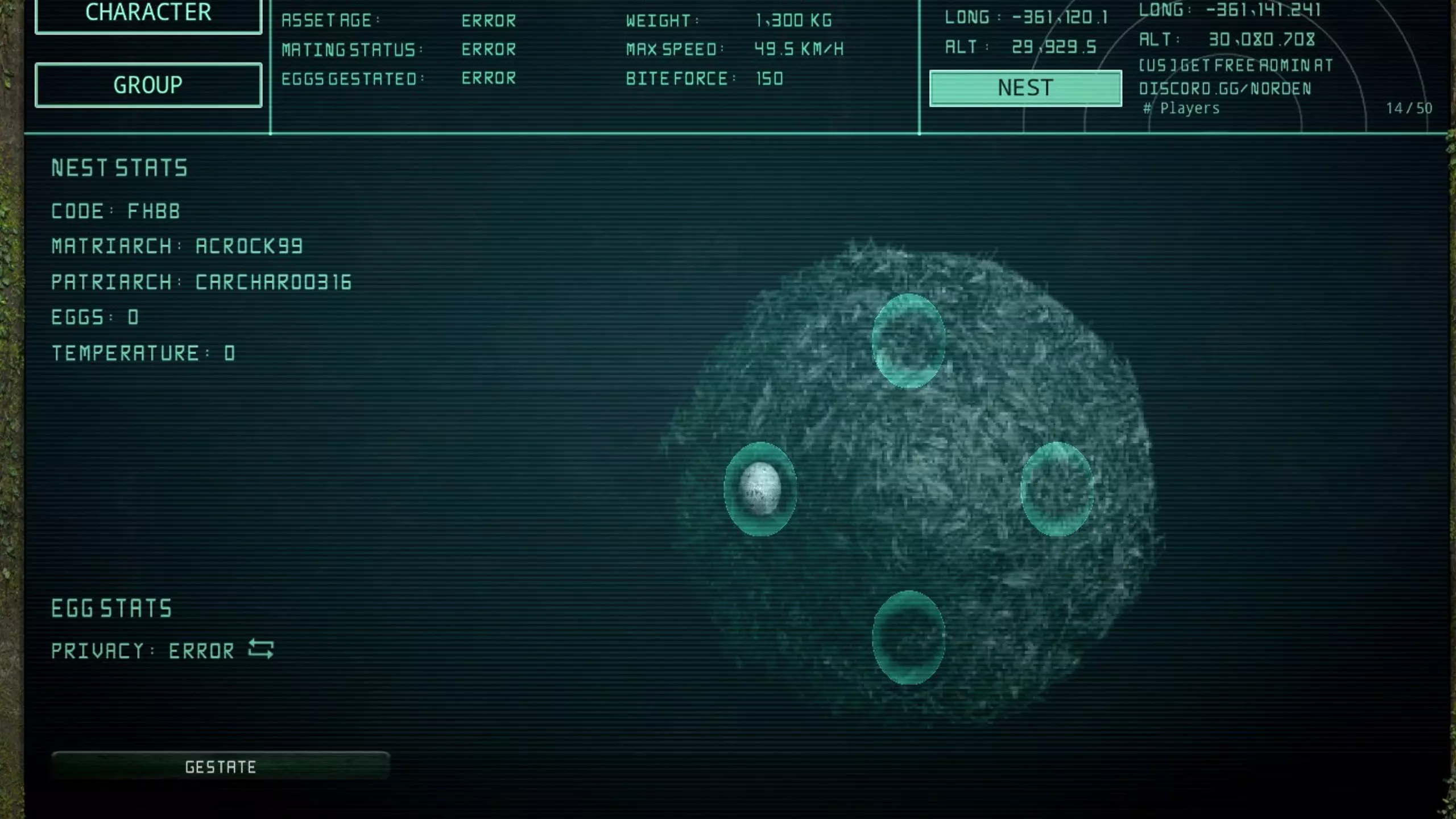 同种生物中成长率超过50%的雌雄个体,在面对面时长按N键即可进行交配。 交配完成后,按N键建造巢穴。巢穴分为挖掘地面建造和收集树枝建造两种类型。 雌性通过Tab键的Nest选项产卵,并进入妊娠期。 将卵放入巢穴后会形成胚胎,此时其他玩家可以接触该卵。 为防止卵死亡,需要坐在巢穴上方等方式调节温度,以保持适宜的温度。 刚孵化的生物无法自行进食,需要由亲代通过口对口喂食呕吐物来提供食物。 【注意】筑巢时建议选择靠近水源的位置。 18:复制系统