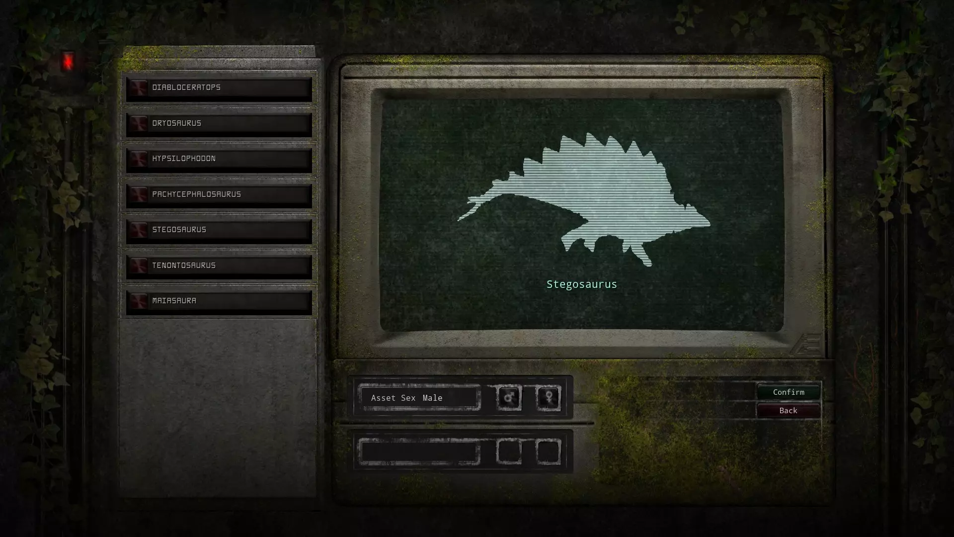 进入服务器后,如果没有恐龙数据,就会出现恐龙选择界面。 从上到下依次为: 草食种(Herbivore) 肉食种(Carnivore) 杂食种(Omnivore) 右侧有人形角色的选项框,但正常情况下无法使用,仅在部分非官方服务器中可以使用。
