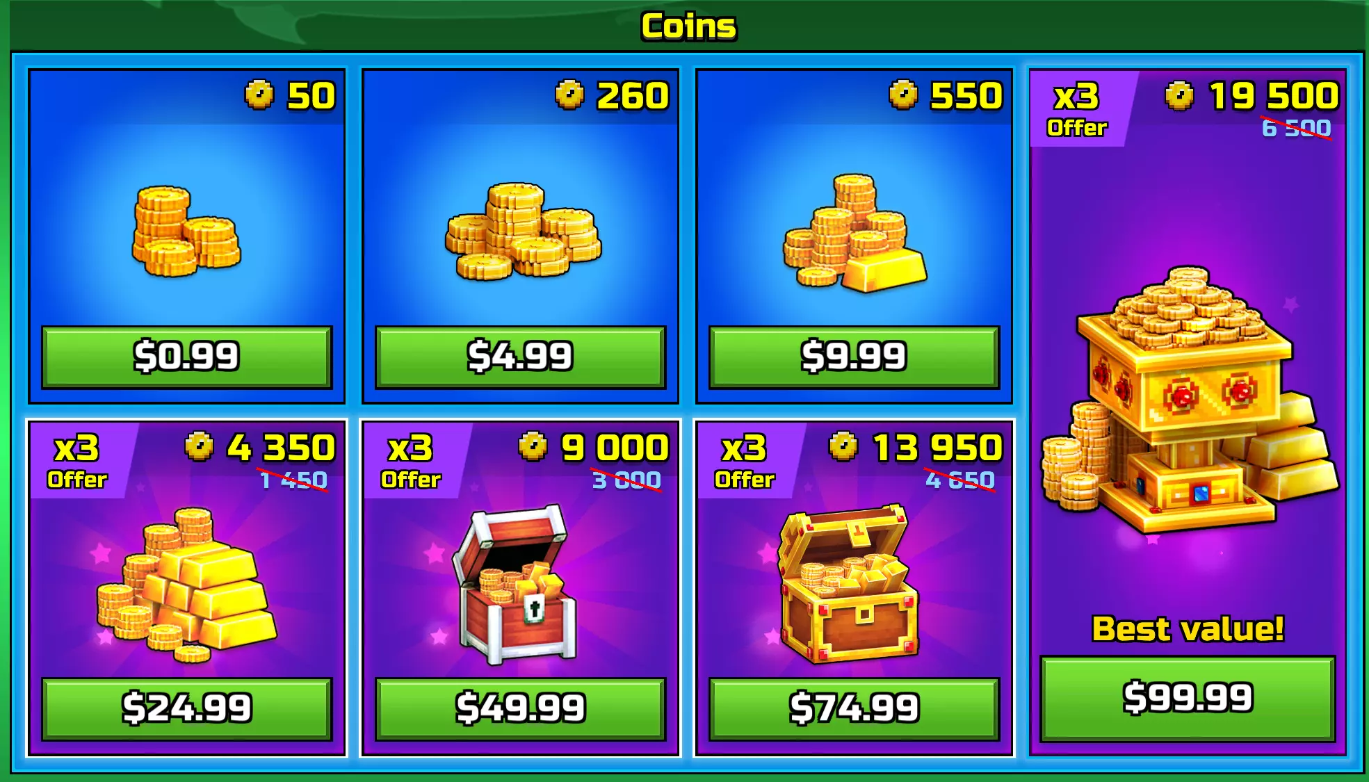 钥匙毫无用处,因为根本不存在负责任的赌博行为。 请向右滚动,直至找到金币和宝石区域。在那里,你可以以99.99美元的价格分别购买这两种货币。