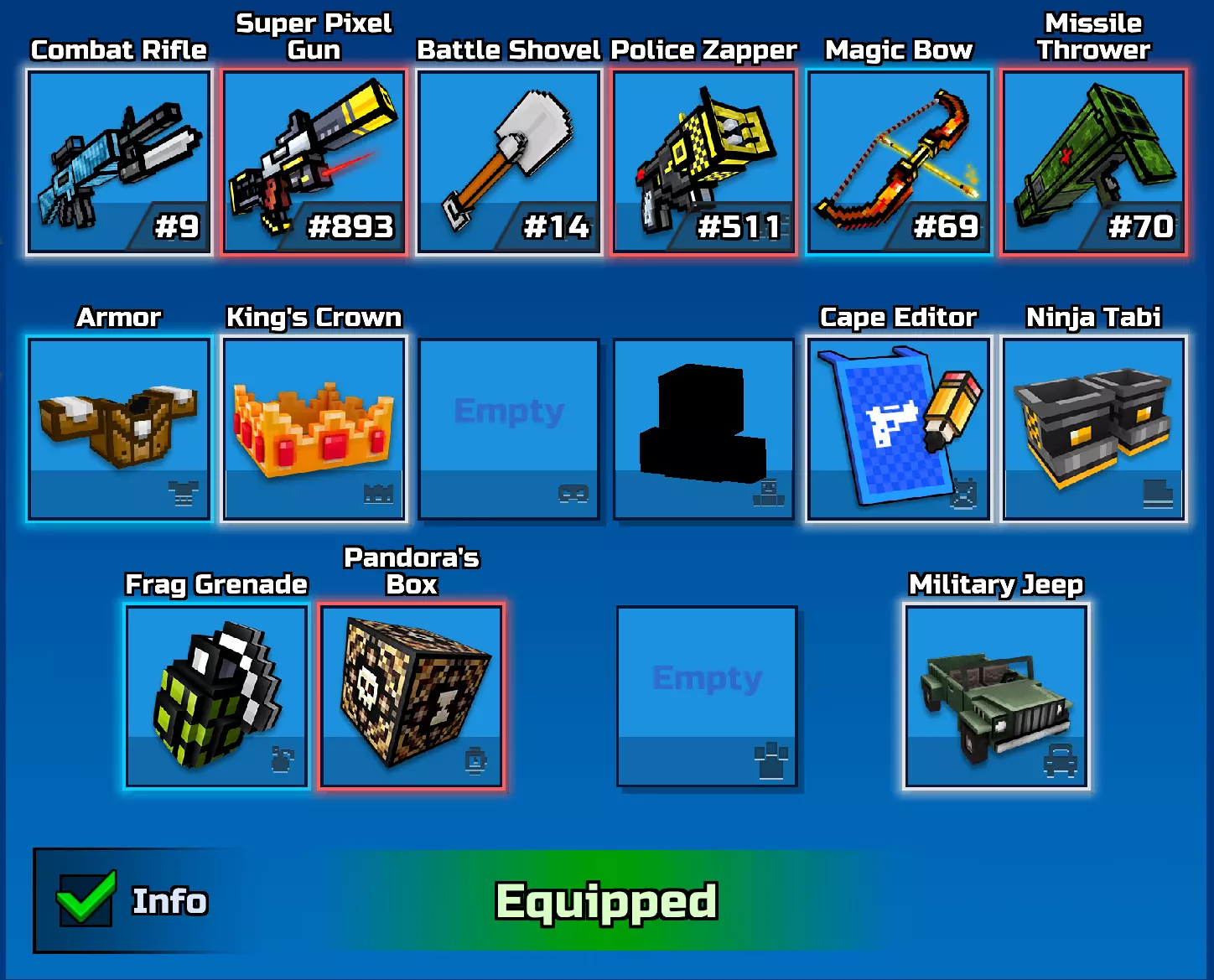 敌人打不到看不见的目标时,肯定会急得满头大汗! 步骤4. 装备 在《像素枪战3D》中,只有两种装备至关重要。 破片手榴弹和潘多拉魔盒。现在就装备它们。