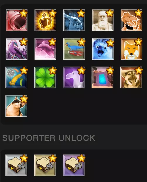 与《中生代山谷》不同,《超越》采用逐步更新的方式,所以当你达到当前等级上限时,确实没什么可做的,但记得时不时回来领取研究奖励,这样就能为即将推出的内容获得一点先机。 成就 《细胞到奇点》有相当多的成就。其中大部分只是阈值目标,当你解锁一定数量的生成器等内容时就能获得。其他则是秘密成就,能为你提供一些达尔文ium。对于想要在Steam上达成完美游戏的玩家,你只需完成以下内容:完成初级模拟、完成中生代山谷-弑君者、完成超越-探索我们的太阳系,以及最繁琐的【鲨鱼周】。在所有隐藏成就中,只有【鲨鱼周】会记录在Steam成就系统中。以下是按游戏内顺序排列的成就列表,方便你查阅。