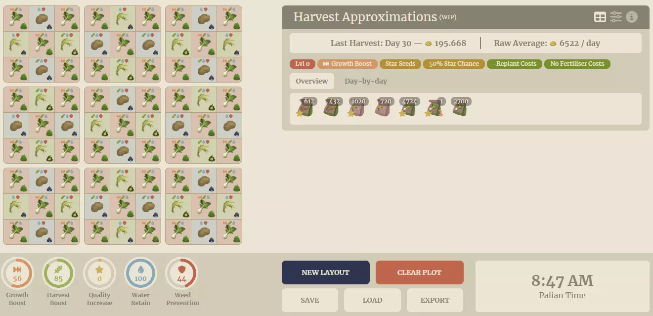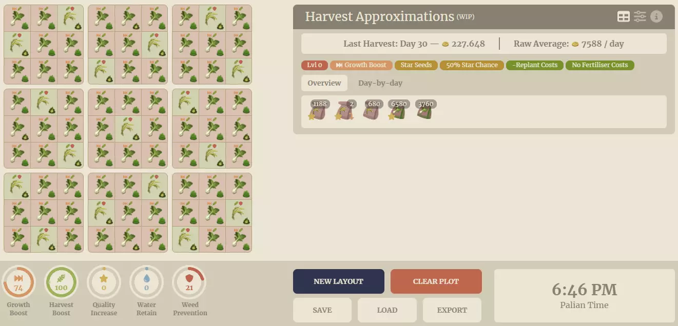 此表格已将种子和加工品的数量与价值纳入考量,并在利润更高的项目旁标注*。表格未计入时间因素,因为增加加工设备即可轻松解决时间问题。 每种作物的单位时间利润各不相同。你可以种植所有作物亲自测试哪种利润最高,也可以直接参考以下结论:在各效果加成组中,最佳选择分别为:白菜、土豆、水稻、棉花。其中,**白菜的利润遥遥领先**。 每日周期: 游戏内植物在每天早上6:00生长,对应现实时间1小时,具体为每小时的15分,即1:15、2:15、3:15等时间点。 以上内容介绍完毕,接下来是最重要的部分:布局方案。无需浇水布局 无需浇水 此布局旨在无需持续浇水即可获得最大收益。只需播种、浇水,偶尔除除草。下次播种前都无需再次浇水。 这是应用程序的布局。右侧是收益估算,其下方是获得各项加成的作物百分比。请注意,这完全基于观察得出,而非游戏内实际计算公式,因此结果为近似值,但目前看来相当准确。