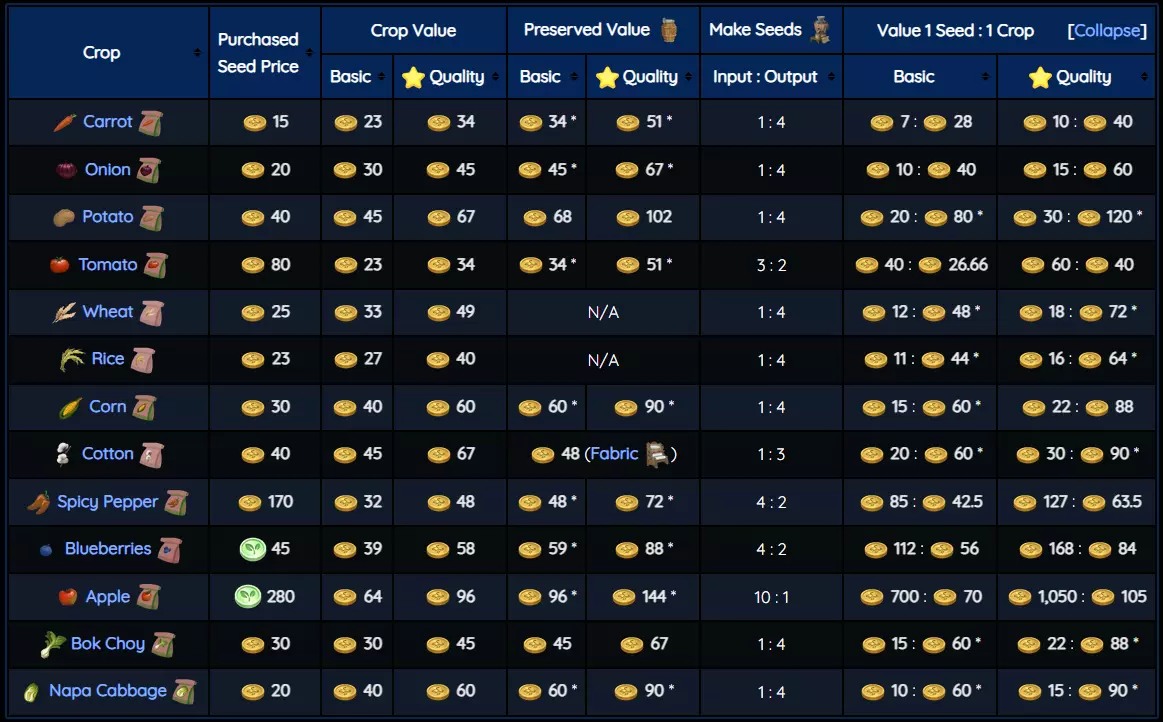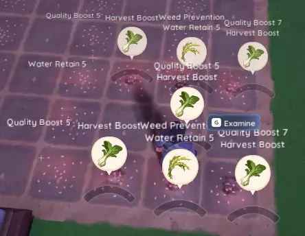 园艺最基础的部分。你必须使用锄头耕地才能种植作物。每块土地有9个种植槽位供你种植作物。锄头也可用于从土地中移除作物。然后,当作物需要时,你要用 watering can 给它们浇水。时不时会有杂草出现在一些作物上,这会阻止作物生长,你必须将杂草拔除。杂草可以出售换取金币,不过有些 NPC 可以将其作为礼物赠送。目前据我所知,它没有其他用途。 你会从园艺 NPC Badruu 那里免费获得两块土地,但从那时起,你必须从他的商店购买其余土地,与他对话即可打开商店。每块土地的价格都比上一块高,最多可购买9块。如下表所示。地块价格: 3级:250 4级:500 5级:750 6级:1000 7级:1500 8级:2000 9级:3000 你可以将它们放置在住宅地块内的任意位置,但建议将所有作物相邻种植,以最大化作物效果加成。 作物效果加成: 每种作物都会对相邻的作物提供加成。 保水性:植物无需浇水。 防杂草:防止植物上长出杂草。 收获量增加:收获时产量提升50%。 品质提升:植物收获时会掉落更多星级品质的物品。额外作物 保水性:番茄、土豆、大白菜 防杂草:胡萝卜、洋葱、小白菜 增产:水稻、小麦、浆果丛、苹果树、玉米 品质提升:棉花、辣椒