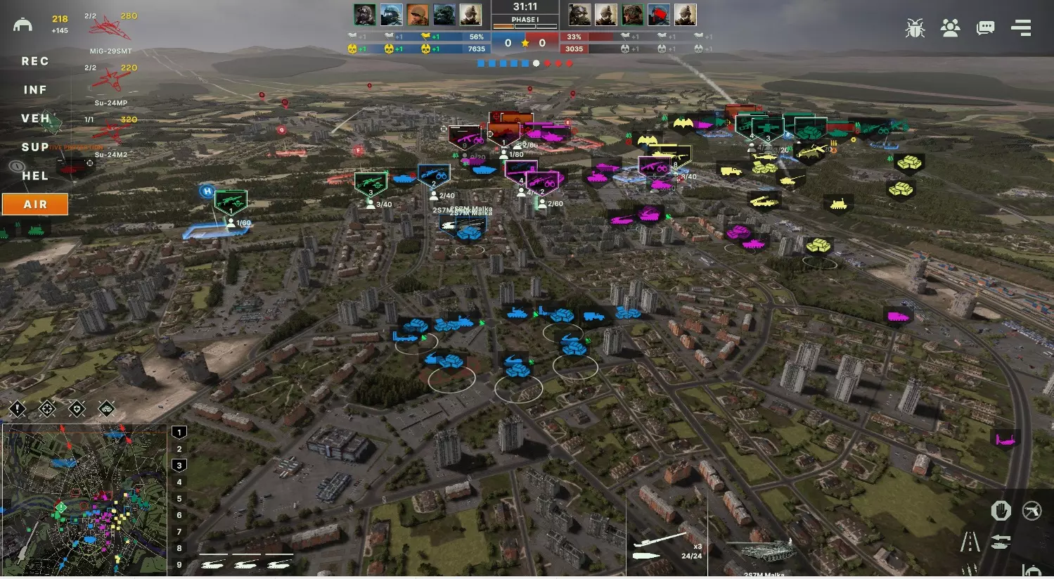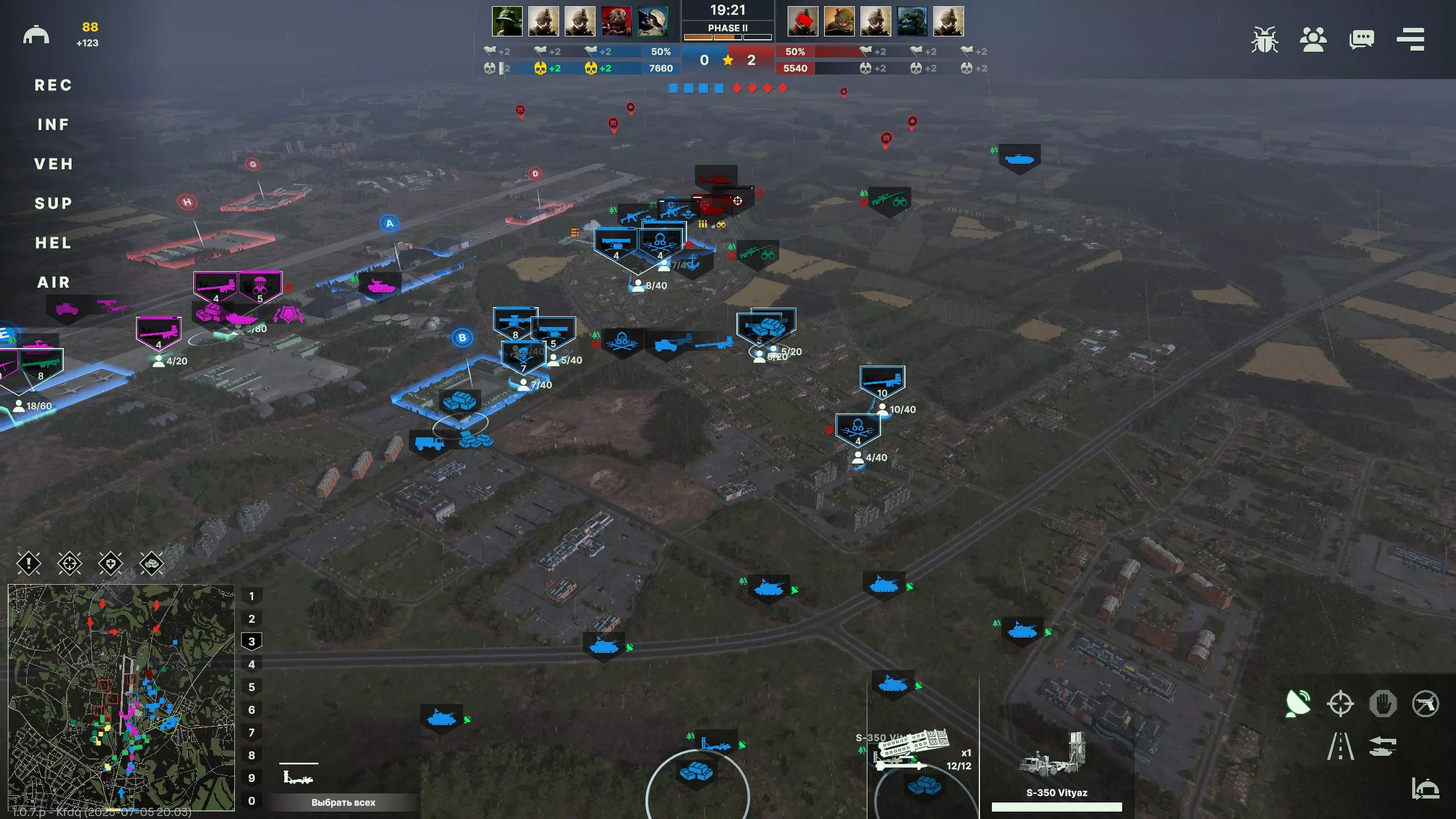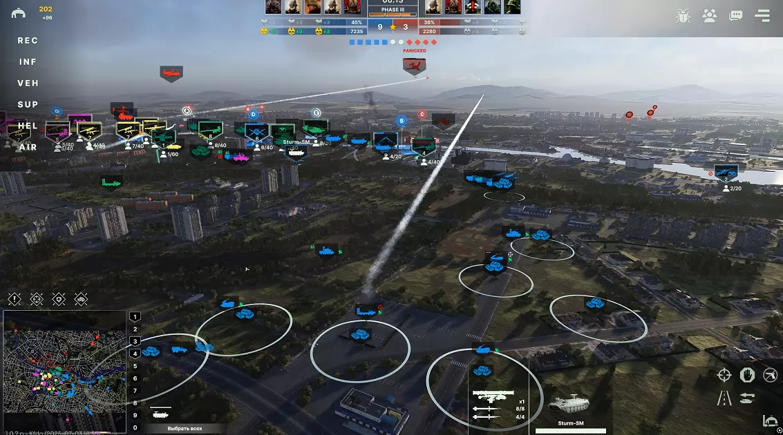 3) Снабжение, с самого начала игры, даже ещё до полной организации ваш хаб начнёт неистово потреблять сапплай. Поэтому практически сразу после установки первых ПВО необходимо подвезти к ним достаточно снабжения, пустая ПВОшка - это беда. Я обычно докидываю сразу по 4тонны на каждую машину и подвожу по мере необходимости, C300 и другая "большая" техника более затратны, на буки 4000-6000 может хватить до конца игры, тунгуски редко расстрачивают свой боезапас полностью, даже против обильной авиации противника, их снабжением можно несколько пренебречь и подвозить только при необходимости. Круг снабжения нужно распологать так, чтобы ПВО находилось на самом краю, тогда при удачном неудачном попадании в снабжение - есть шанс, что техника выживет и сумеет сменить позицию. 4) Понимание особенностей работы ПВО в игре. Тут мы дошли до стадии, где присутствуют некоторые нюансы, часть из которых спорная, буду рад если в обсуждении случатся уточнения, по мере поступления информации - буду обновлять. В игре есть система умного таргетинга, работает она следующим образом, первым сводиться начнёт то ПВО, которые легче достаёт до цели, то есть с300, соответственно большинство дронов, самолётов, баллистических ракет и далеко пущенных крылаток будет сбиваться именно им. Буки при этом будут сохранять свой боезапас и станут отстреливаться по прилатющим уже к нам ППВО ракетам или совсем обнаглевшим самолётам. Тут возникает следующий вопрос, почему сразу оба С300 не сводятся сразу же в один самолёт который в их зоне досягаемости - в игре присутствует механика, назовём её оверкил, если компьютер посчитал, что условный миг 29 будет снесён одной ракетой с300, то второй даже не будет напрягаться, хотя игрок на противнике может применить хитрые манёвры с измением высоты, ловушками и в итоге уклониться, а могут кубики не так бросится и ракета потеряет цель сама. В таких случаях, для уверенного поражения можно вручную приказать второму комплексу взять цель (хотя это и не всегда целесообразно) 5) А когда уже можно включать всё на радар и не париться? После установки всех трёх линий хотя бы с 1 тунгуской, 1 с300 и 3 Буками уже можно включать радар и практически не волноваться, что пара проулеров всё сожрет, постепенно укрепляя линии и насыщая пво. На полной расстановке из 2 тунгусок 2 с300 и 3 буков такая оборона способна самостоятельно выдержать и отбить натиск из 4-5 SEAD самолётов без потерь, да и не забывайте, что союзники тоже чего-нибудь да вызовут. В идеале конечно - нужно всё время проглядывать за состоянием своего пво-узла, например могут кончится снаряды и ага. F.A.Q. Нужна ли какая-либо специфическая колода для создания такой сетки пво? - Нет, на мой взгляд лучше всего подходят мото-мех и мото-танк, но варианты можно придумать разные Можно ли собрать что-то подобное за США - Да, запросто. Противники мало используют дроны и авиацию и не запускают более 2 SEAD самолётов одновременно, нужно ли строить такой большой узел? - Всё ситуативно, в моей колоде для неплохой работы пво достаточно связки из 1 С300 3 Буков и 1 тунгуски, остальные силы можно пустить на насыщение фронта Сработает такое при игре с рандомами? - Да, вполне, просто нужно проговорить этот момент и попроситься на центр карты, многие будут очень рады скинуть с себя ПВО-ношу. Хотя, конечно лучше играть хотя бы с парой надёжных товарищей. 