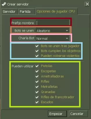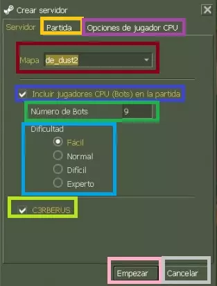 会出现以下菜单,我将为大家说明各项功能的用途。 粉色:开始游戏。 灰色:关闭菜单。 红色:选择游戏地图。 蓝色:在游戏中启用机器人。 绿色:选择机器人数量。 天蓝色:选择机器人难度。 黄色:启用C3RBERUS机器人。 橙色:游戏选项。 紫色:机器人额外选项。